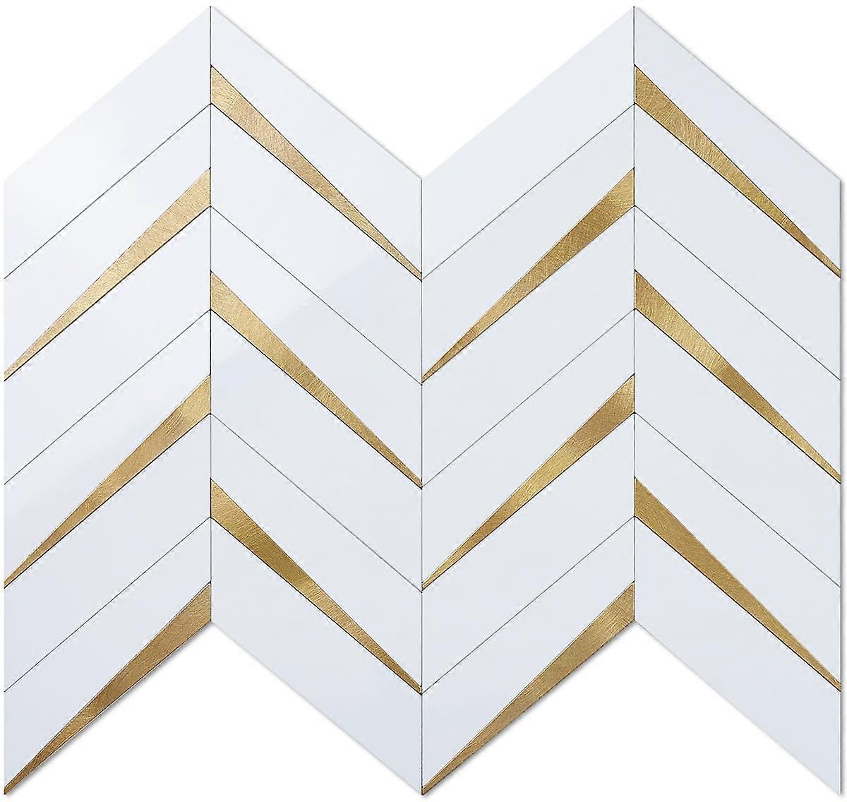 Peel and Stick Kitchen Backsplash Tiles White and Gold Herringbone Waterproof Heat Resistant PVC