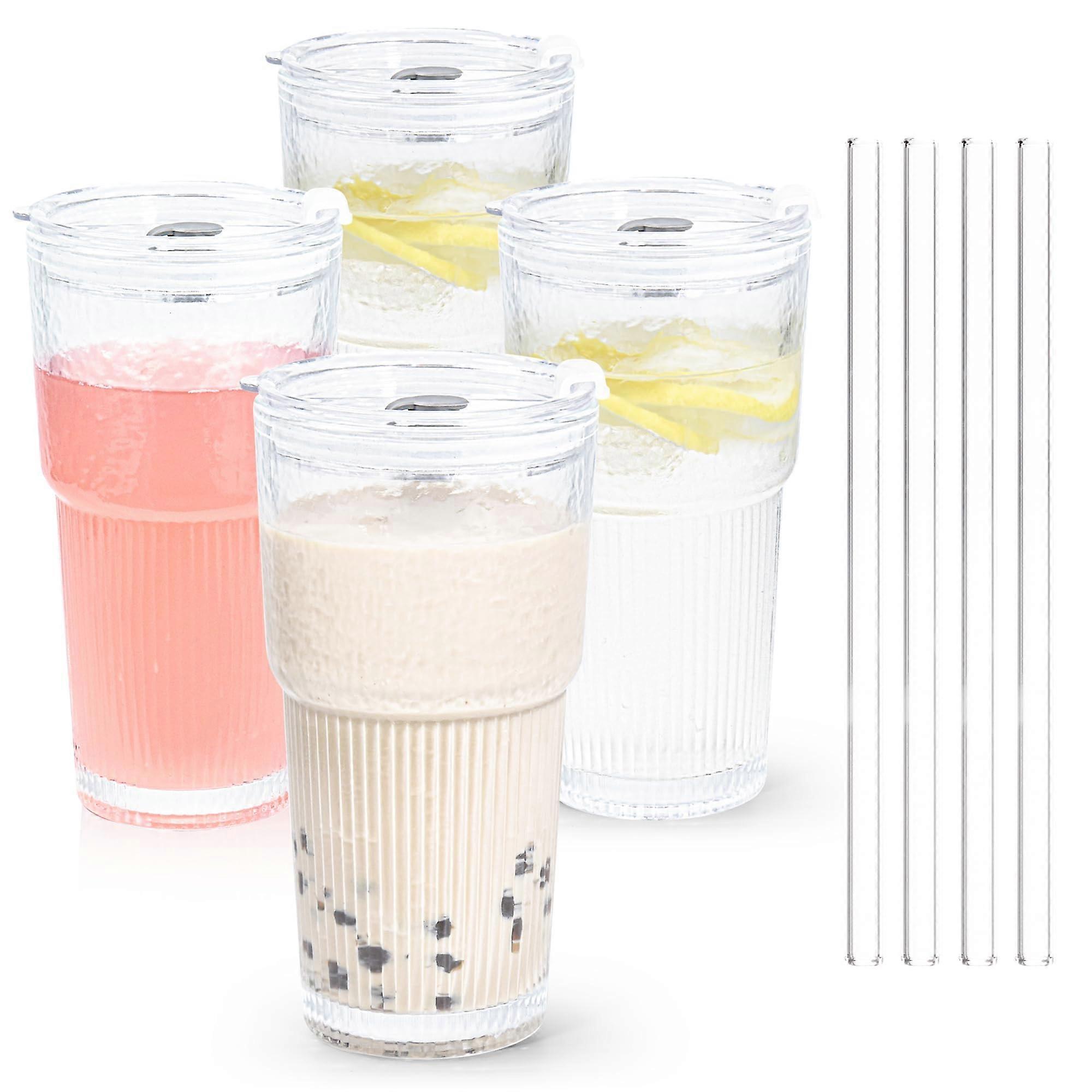 20oz Ribbed Glass Cups with Lids and Straws, Leakproof Vintage Tumblers for Iced Coffee and Tea