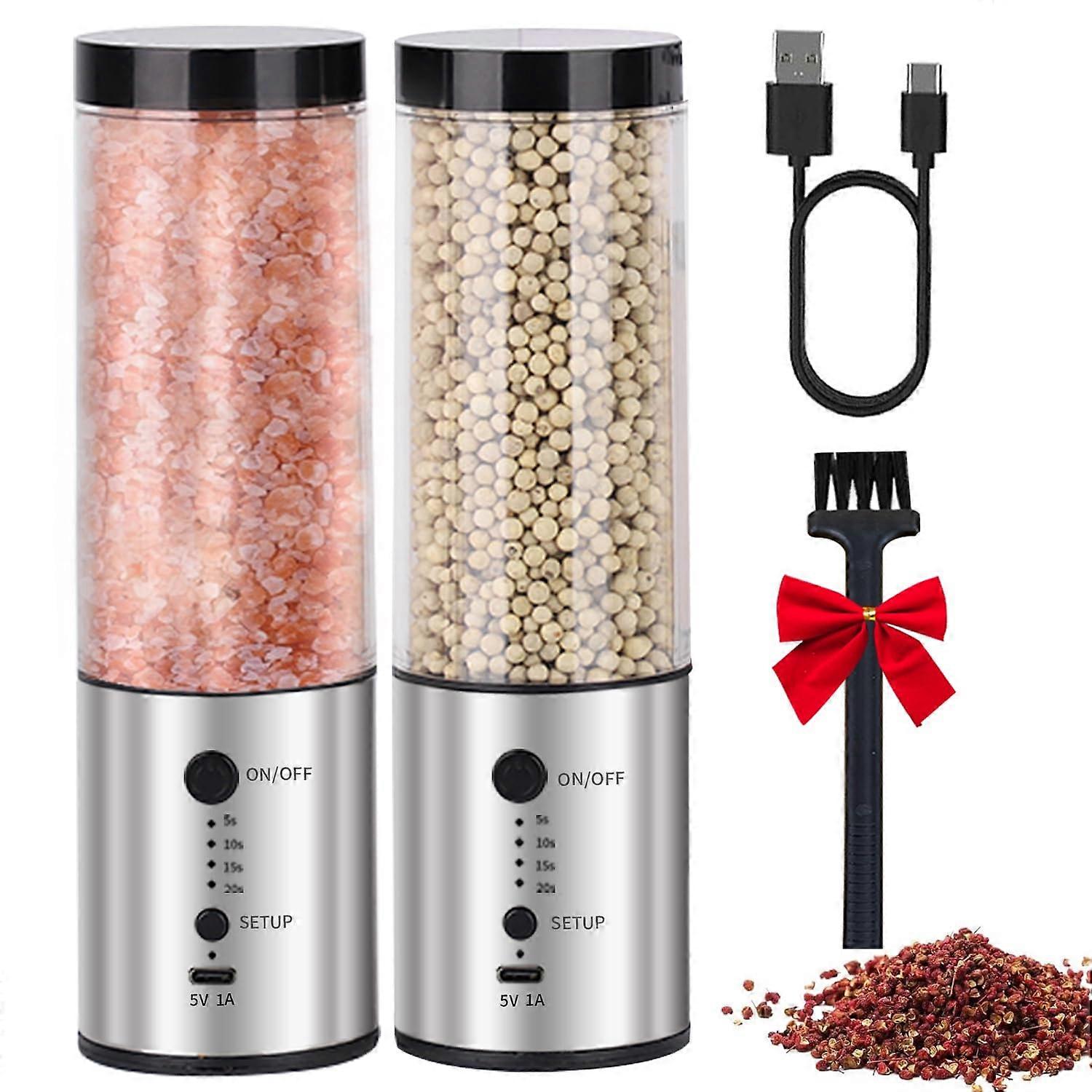 Twin Pack Value – Two Grinders in One Set Get two quality grinders at a 30% savings compared to individually. Ideal for keeping peppercorns and sea salt separately, preventing flavor mixing. The set comes in a single giftready package, eliminating the need for extra boxes. Dual Control for Effortless Seasoning Each grinder operates independently with its own onetouch button and has four adjustable timer settings (5s, 10s, 15s, 20s). Fill them with black pepper, pink Himalayan salt, dried herbs, or spices. The durable ceramic grinding cores ensure smooth performance and prevent residue transfer between seasonings. Luxury Gift Set for Kitchen Enthusiasts The twin grinders feature a brushed metal finish, packaged in an elegant gift box. for housewarming presents, wedding registries, or as a thoughtful gift for cooking enthusiasts. Each set includes a cleaning brush and dust covers to keep your grinders in pristine condition. Smart USBC Charging With Battery Alert Conveniently recharge using the included USBC cable. Dualcolor LED indicators instantly display battery status: green indicates ready to use with at least 30 percent charge, red signals low battery below 30 percent and time to recharge. Avoid unexpected power loss and keep seasoning uninterrupted in busy kitchens. Practical Applications Daily cooking at home: Quickly season dishes during meal prep without manual grinding effort. Outdoor dining or BBQ: Cordless design makes it easy to take anywhere for fresh seasoning on the spot. Entertaining guests: Enhance presentation with stylish grinders that deliver consistent results every time. Specifications Material: Brushed metal body with ceramic grinding core Operation: Independent onetouch button controls per grinder Settings: Four timer options for precise seasoning Power: USBC rechargeable battery Included accessories: Cleaning brush, dust covers, USBC charging cable Packaging: Single elegant gift box This twin pack is designed for convenience, style, and consistent performance, making it a reliable addition to any kitchen or dining setting.