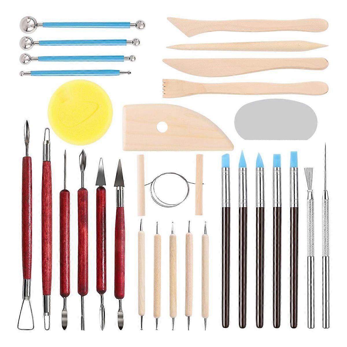 30PCS Clay Tools Kit]6 wooden clay tools, 11 metal clay tools, 2 metal needle tool,1 metal rib,1 pottery sponge, 4 ball stylus, 5 rubber pens,1 storage bag, easy to carry. Multi Functional Clay Tools For DIY]The clay tools can be use as sculpting, modeling, molding, cutting,shaping, scraping, smoothing, brushing, dotting, carving, drawing tools. Exploring Your Life With Our Ceramics Tools]You can use our ceramics tools to DIY a pottery as a gift for yourself, your friend, your kids or your family.Our air dry clay kit helps you to explore your life, and promote your creativity and imagination. A Nice Gift For Pottery DIY Enthusiast]It can be used in school clay class, pottery DIY activity, family pottery activity, parenting clay activity.It help you to a simple and by yourself. It's a nice gift for clay DIY beginners or professionals. Practical Pottery Tools Set]The pottery tools are made of wood, stainless steel, plastic and other materials, simple and sturdy, easy to use and storage. Color: As Shown Material: Wooden, Stainless Steel Package Contents: 30 * Clay Sculpting Tools Only the above package content, other products are not included. Note: Light reflection and different displays may cause the color of the item in the picture a little different from the real thing. The measurement allowed error is +/- 1-3cm.