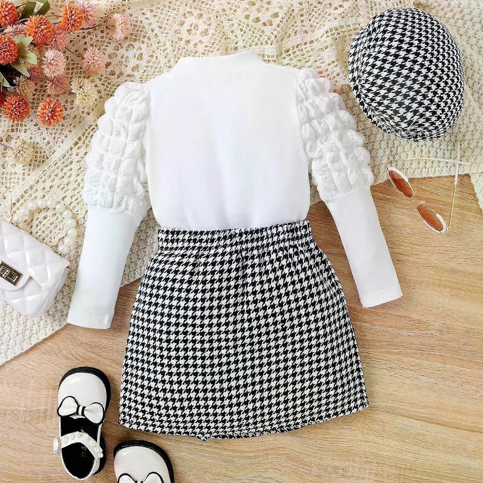Girl Autumn Outfit Knitted Top Houndstooth Black and White Skirt British Style Hat Three-Piece Children Set Stylish Kid Dress