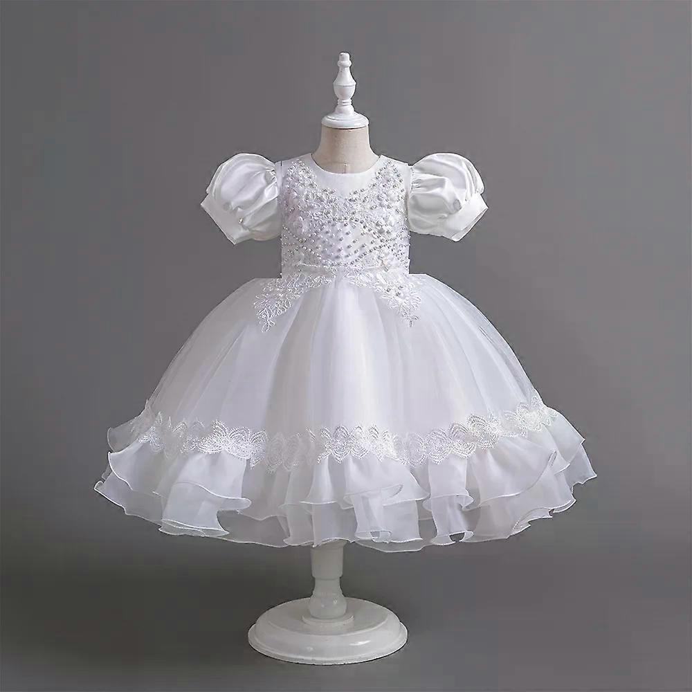 Layered Tulle Girls Skirt Ruffled Lace Trim Princess Style Party Gown Kids Puff Sleeved Beaded Children Embroidery Putty Dress