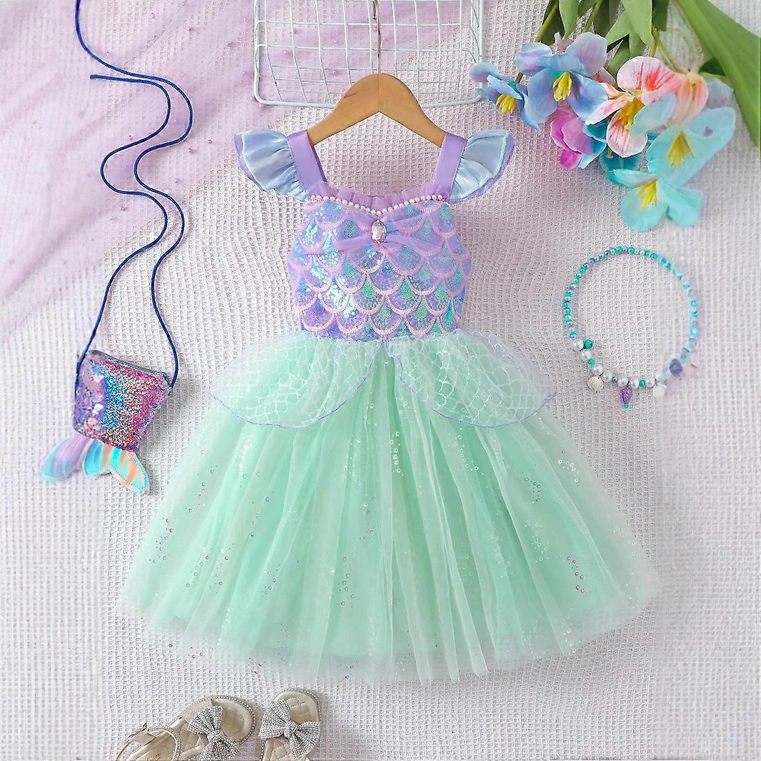 Girls Scale Shaped Sequin Bodice Pearl Embellished Neckline Tulle Skirt Kids Flutter Sleeved Mermaid Dress Children Putty Gown