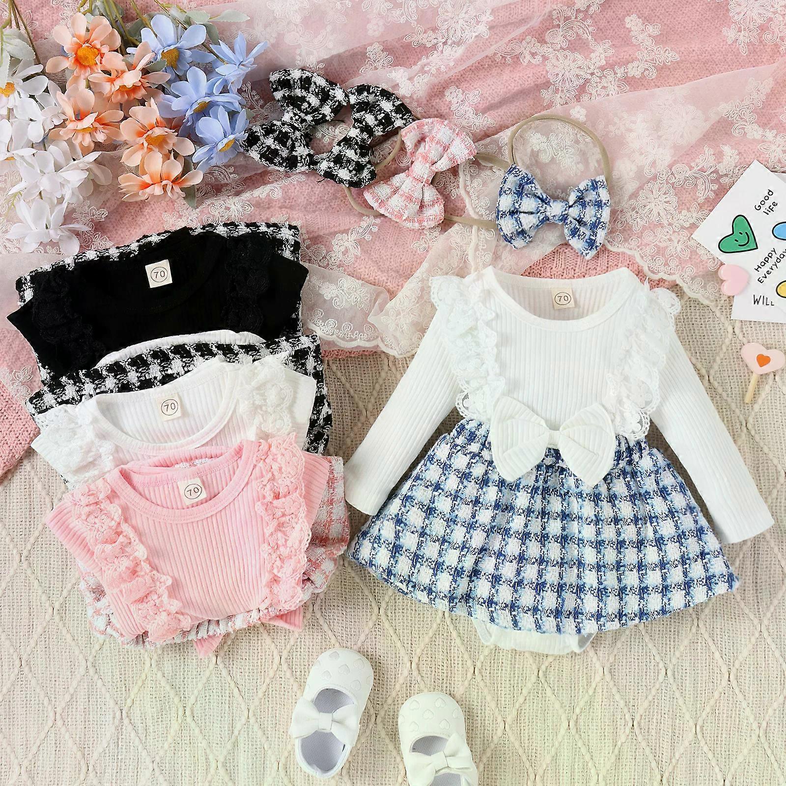 Girls Lace Solid Color Long Sleeve Patchwork Braided Plaid Skirt Bow Children Toddler Kit Kids Little Fragrance Cute Bow Dress