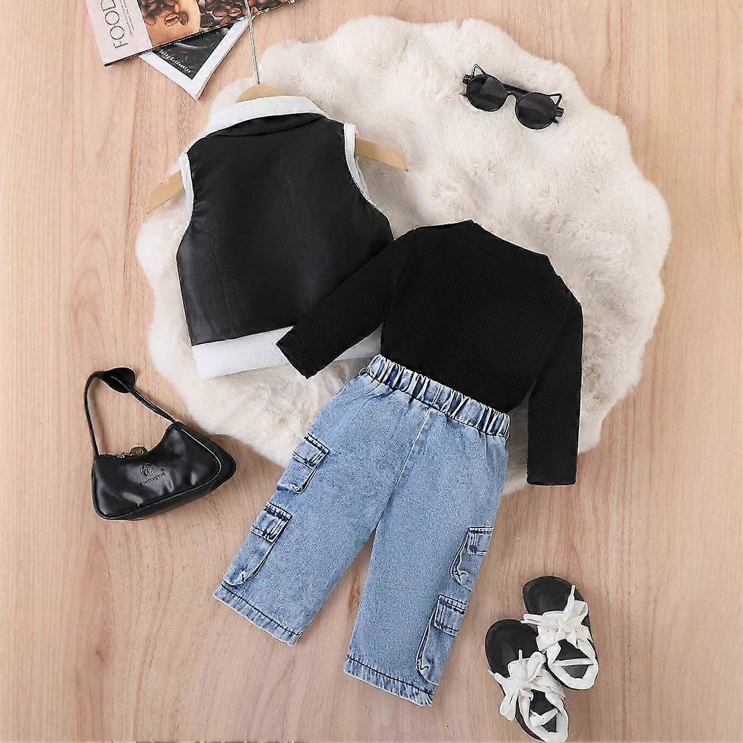 Solid Black Top Long Sleeves Black and White Color-blocked Leather Jacket Jean Three-piece Set Children Toddler Suit Girls Suit