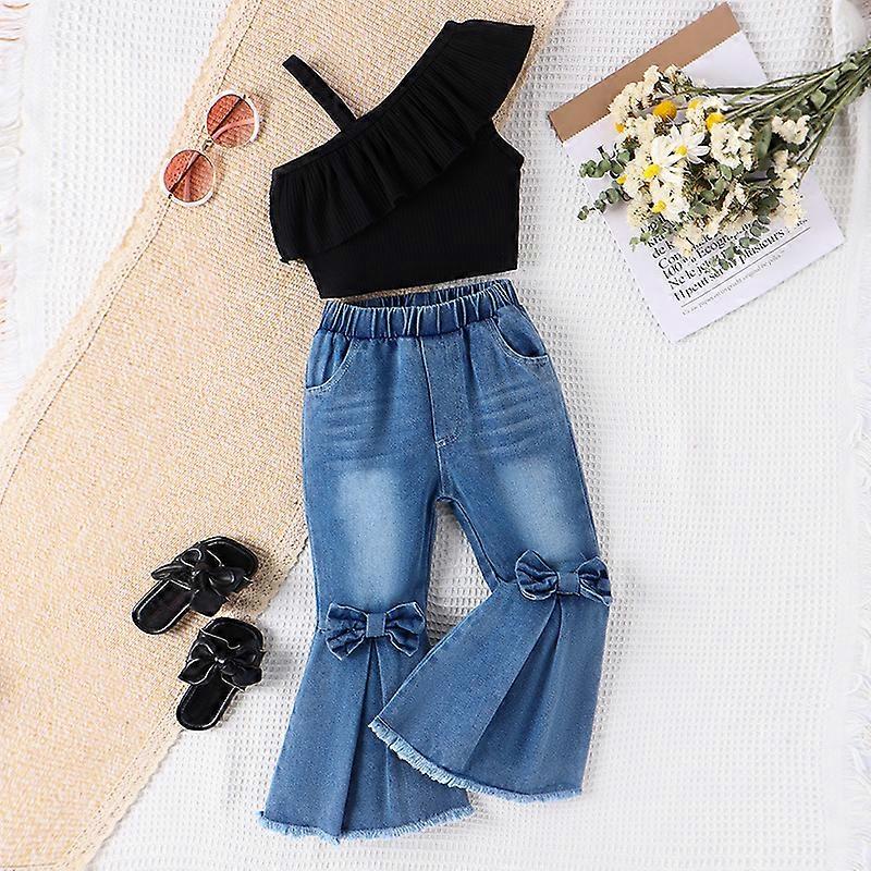 Summer Suspender Slanted Shoulders Ruffled Sleeve Tops Denim Bow Trend Bell Pants Set Baby Girls' European and American Style
