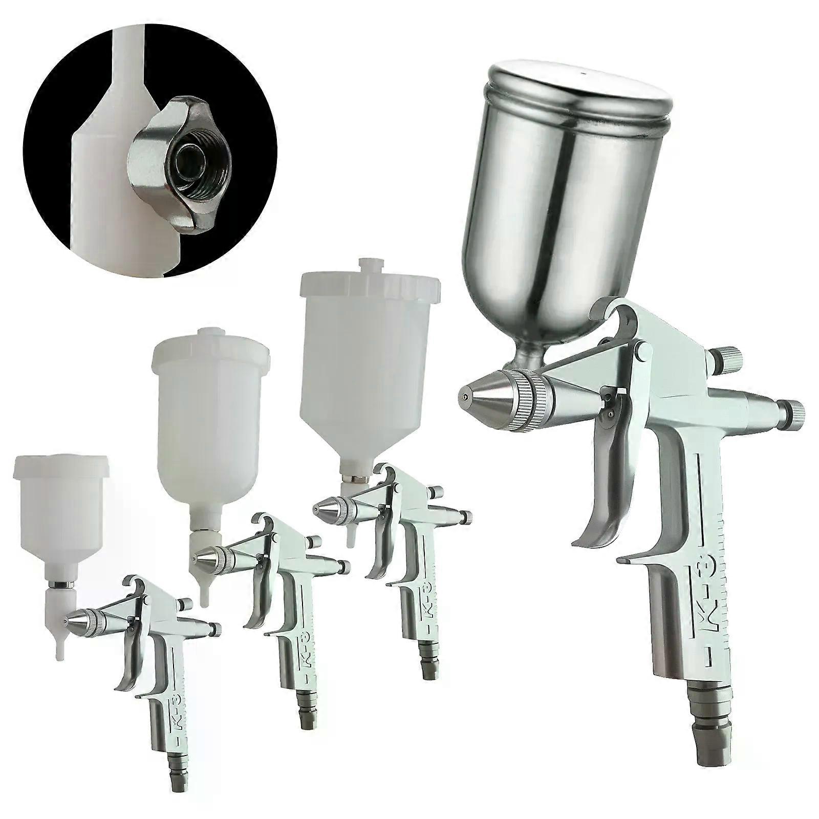K-3 05mm Mini Spray Gun Professional Pneumatic Airbrush Sprayer Alloy Painting Atomizer Tools w/ 125/150/250/400/600ml Cup K-3 Mini Paint Air Spray Gun 0.5mm Atomizing Nozzle Air Sprayer Atomizer Airbrush Alloy Leather Painting Tool, w/ 125/150/250/400/600ml Cup Features: * new and high quality *Easy to operate, good atomization effect *Applicable to automobile spray paint, wood spray paint, wall spray paint *Atomization: Improve paint efficiency, uniform and delicate, copper processing, wear-resistant, durable *Nozzle: Made of stainless steel, hardened and wear-resistant, with a long service life and good sealing performance *Spray range control: The spray range knob adopts a special anti slip design, fine spray control, and saves paint *Air pressure adjustment: Turning the adjustment screw clockwise can reduce the air volume, while turning it counterclockwise can increase the air volume *Spray machine trigger: Flexible operation, good hand feel *Perfect ergonomic design reduces wrist fatigue Specifications: Product name: Small area repair spray gun Model: K-3 Material: aluminum alloy + stainless steel Nozzle caliber: 0.5mm Feeding method: Gravity Capacity: 150ml (Or 125ml、250ml、400ml、600ml optional) Working pressure: 1.5-4Bar Spraying distance: 16-25cm Gas consumption: 35L/min Air Inlet: 1/4” Applicable range: Automobiles, Industry, etc. Applicable paint: Water-based paint, metal paint, paint. _x000D_
