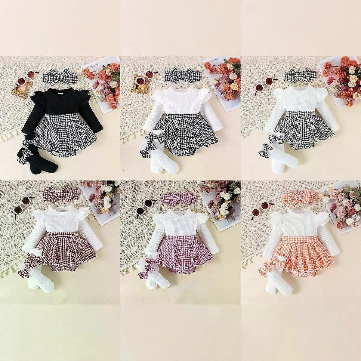 Sleeve Plaid Hakama Toddler Sock Bow Tiara Three-piece Children Skirt Cute Baby Suit Girl Dress Solid Color Fly Sleeve Long Kid