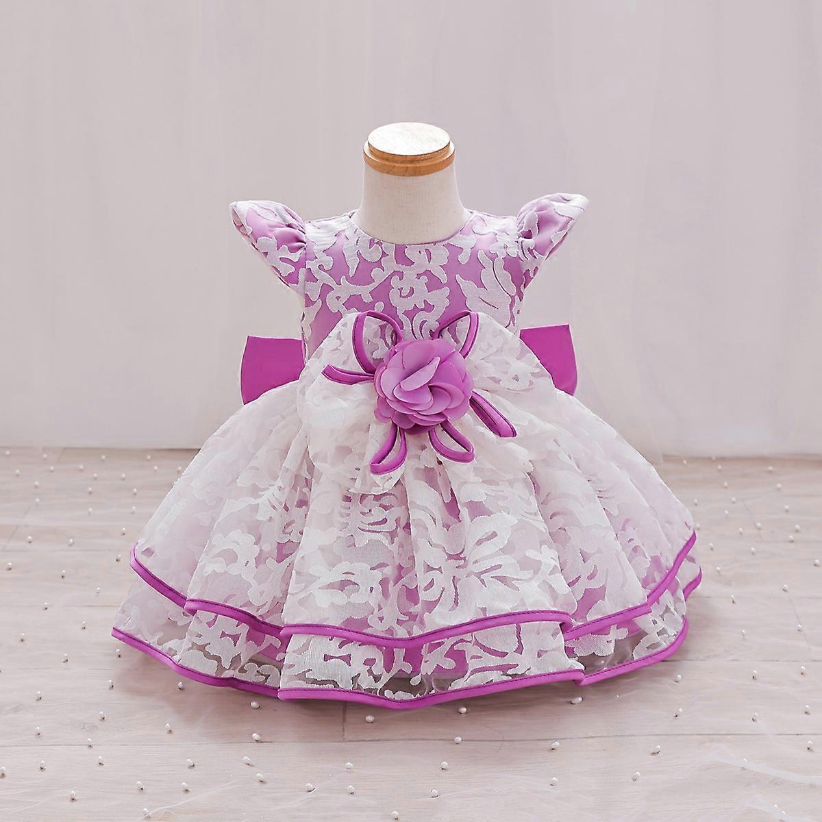 Kids Puff Sleeved Lace Jacquard Baby Dress Children Two Tone Color Blocking Flower Bow Outfit Satin Ribbon Trim Girls Party Gown