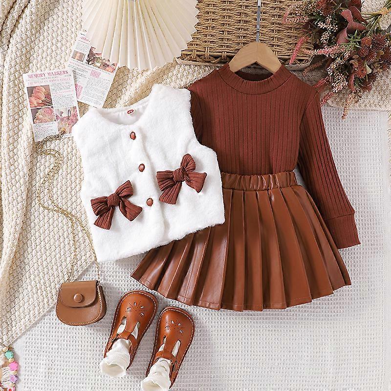 Long Sleeve Inner Sweater Bowknot Plush Vest Leather Short Skirt Girl Three-Piece Autumn Children Set Princess Style Kid Dress