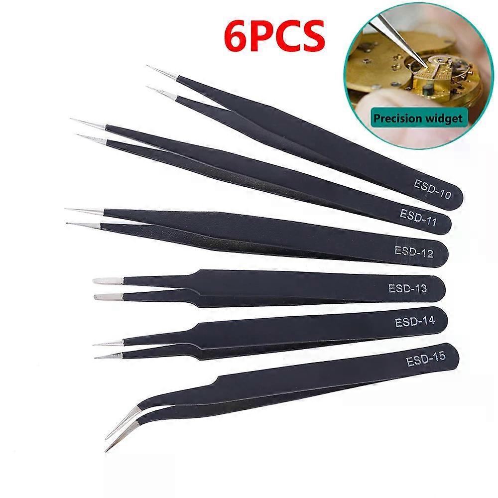 6Pcs ESD Stainless Steel Tweezers Set Industrial Precision Curved Straight Tweezers for Maintenance Repair Tools