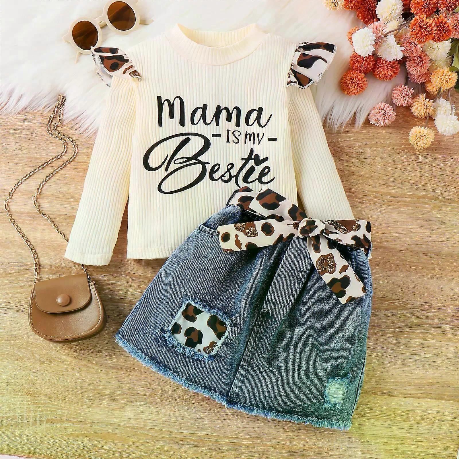 Fashion Children Suit Girls Black Printed Leopard Print Skirt Panel Flying Sleeve Top Denim Ripped Skirt Kid Leopard Belt Dress
