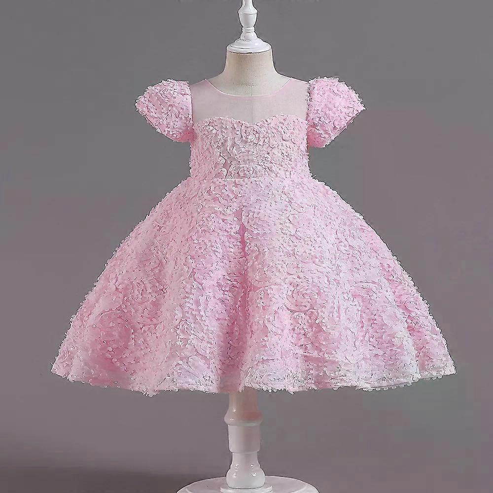 Kids Puff Sleeved Princess Style Lace Embroidered Dress Girls Heart Shaped Neckline 3D Floral Tulle Skirt Children Elegant Gown