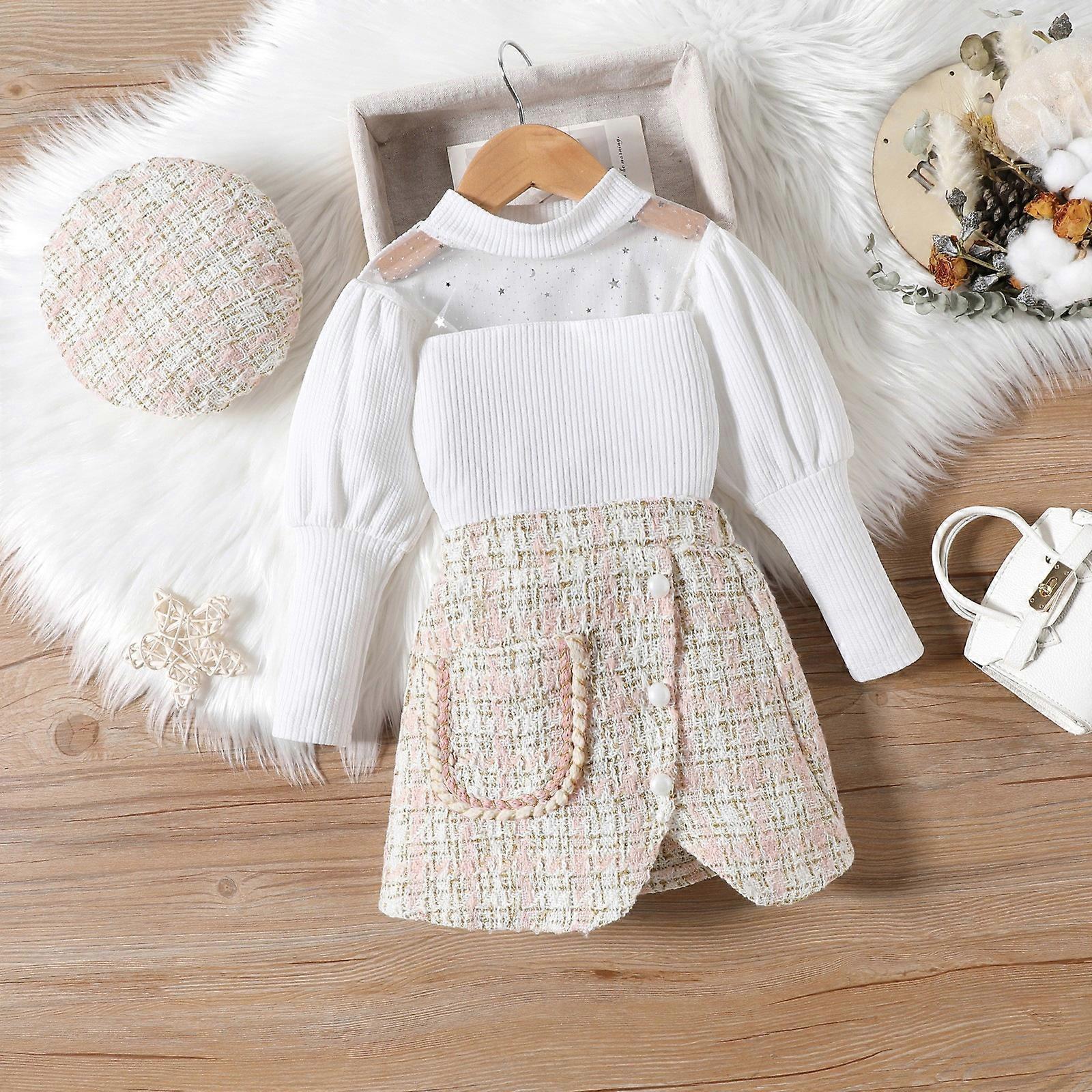 Mesh Neckline Puff Sleeves Long Sleeve Top Irregular Short Skirt Beret Three-piece Set Children Kit Baby Clothes Kids Girl Suit