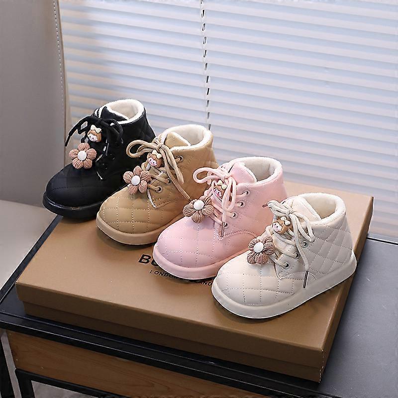 Children Winter Fashion Snow Boots Girls Fleece Front Lace-up Non-slip Short Booties Girls Flowers Thickened Plaid Leather Boots