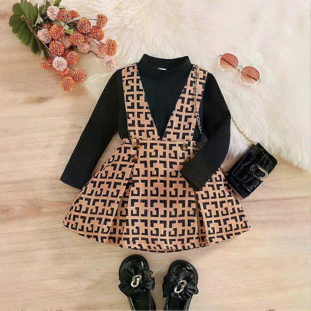 Girls Kids Classic Printed Overalls Dress with Turtleneck Long-Sleeve Top Set for Toddlers Baby Children Autumn Winter 2-Piece
