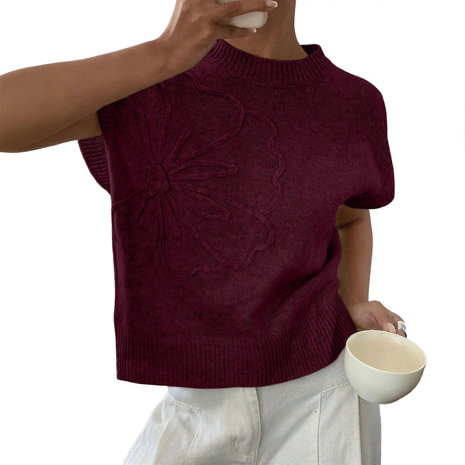Women's Solid Color Printed Knitted Short-Sleeve Top Burgundy XL