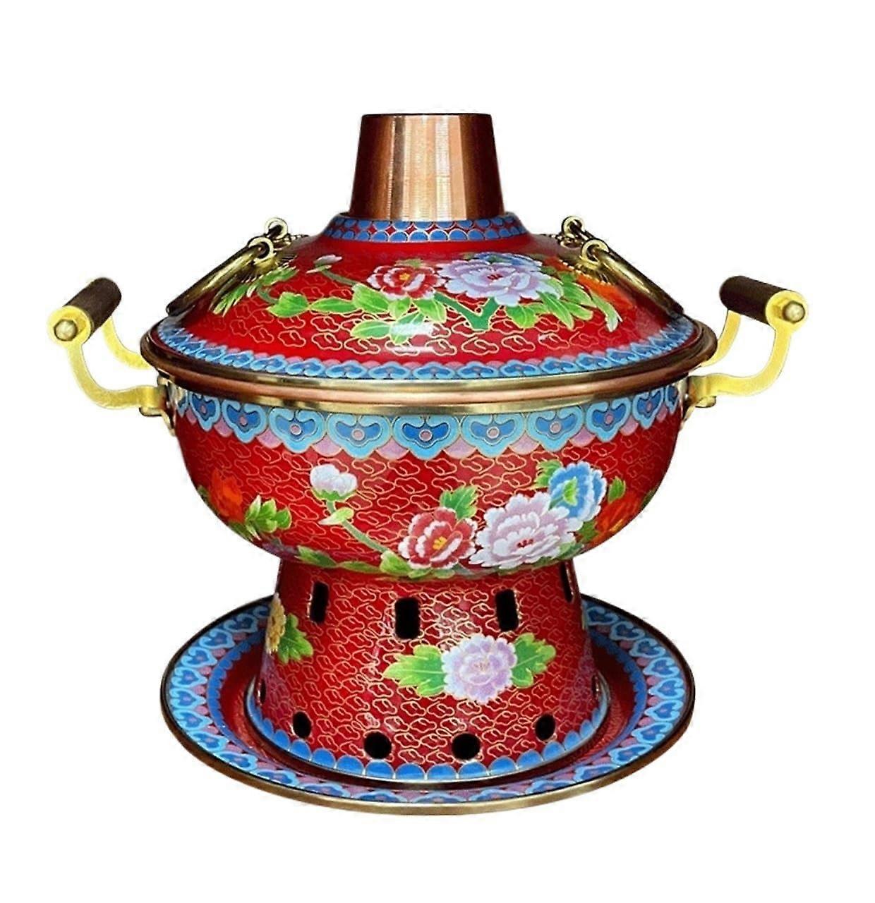 Copper Cloisonné Hot Pot Single Serving Chinese Enamel Pure Copper Fast Heat Easy Clean Red 19x22cm