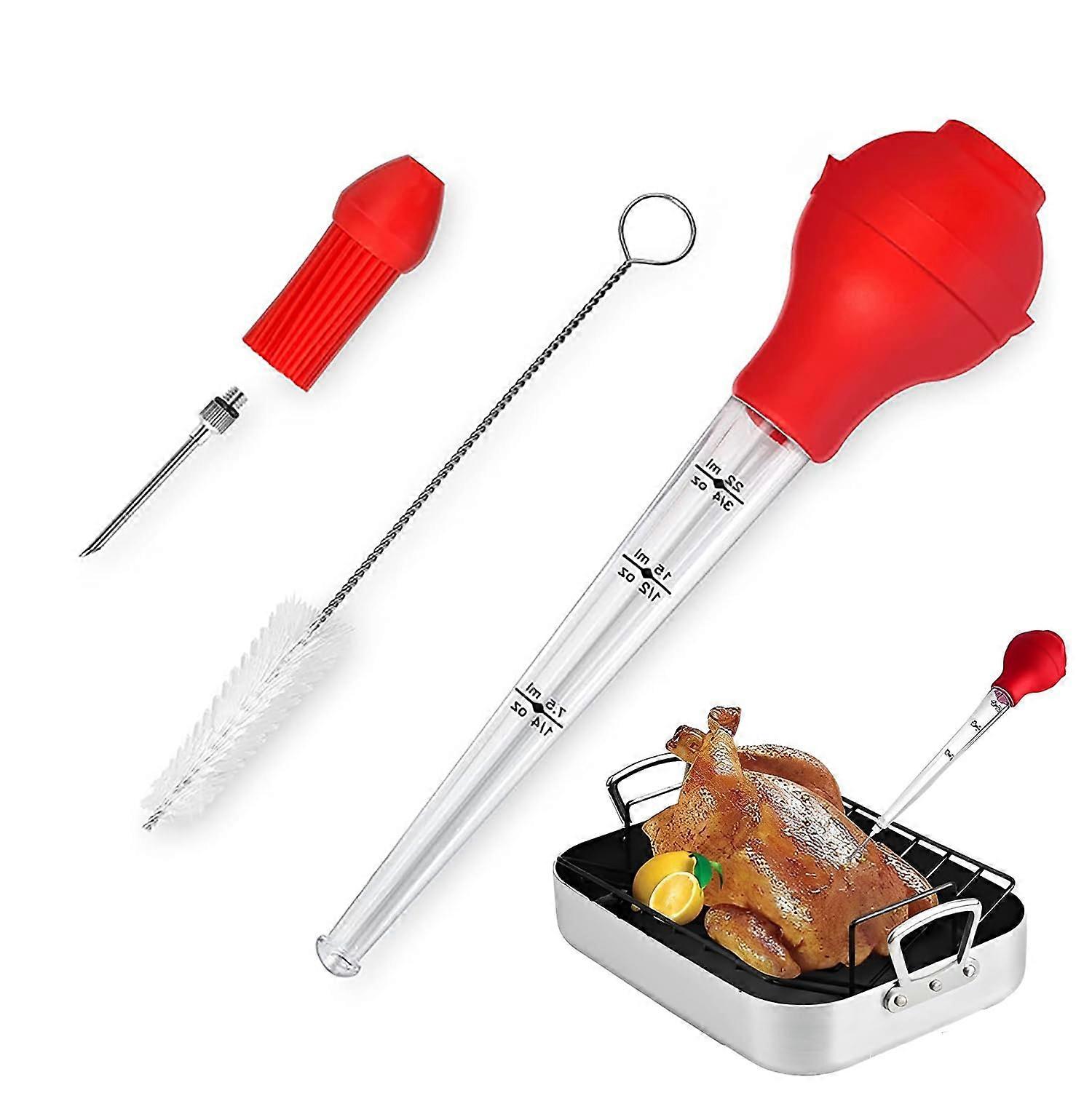Food grade silicone baster with a heat resistant bulb head up to 450°F/230°C. 3/4 oz capacity, 100% food grade silicone, BPA. Includes stainless steel injector needles. Suitable for kitchen use, outdoors, garden, family dinners, birthday parties, Thanksgiving, and Christmas. Key benefits Delivers flavorful juiciness by injecting marinades, herbs, sauces, and fats into meat with stainless steel injector needles, allowing deeper penetration without damaging the roast. Even coverage with a welldesigned silicone applicator brush; thick silicone bristles resist clumping and shedding for smooth saucing. Clear tube with dual scales (ml and Oz) for easy measurement and avoiding unit conversions; an angled band on the bulb helps keep the baster steady on the countertop when not in use. Design and materials 100% foodgrade silicone bulb and tube, paired with stainless steel injector needles. BPA construction for safe contact with food. Detachable bulb and tube for easy disassembly and cleaning. The angled bulb band provides stability on the counter. Performance and use Ideal for injecting flavor into poultry, beef, pork, and other roasts; followed by brushing to coat with sauces for even coverage. Suitable for kitchen, outdoor grilling, barbecues, garden barbecues, and various family gatherings. Use scenarios Scenario 1: Thanksgiving or Christmas turkey – inject flavorful juices into the meat before roasting and use the brush to baste during cooking for a rich, even glaze. Scenario 2: Outdoor barbecuing – inject marinades into chicken, pork, or beef, then baste with sauce during grilling to enhance moistness and flavor. Scenario 3: Family dinners or parties – baste vegetables or roasts for consistent flavor throughout the dish and keep sauces ready for easy application. Cleaning and maintenance Bulb and tube separate for thorough cleaning; cleaning brush included. Dishwasher safe; also easy to hand wash for quick maintenance.
