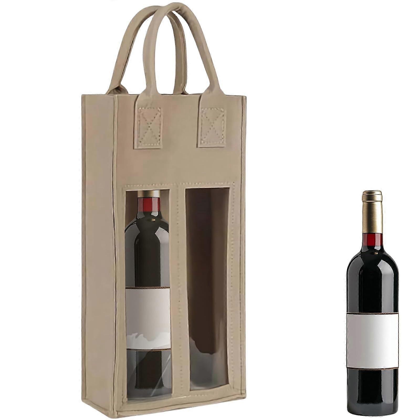 Reusable Felt Wine Gift Bag with Clear Window, Double Bottle Carrier Tote for Travel and Parties, Beige