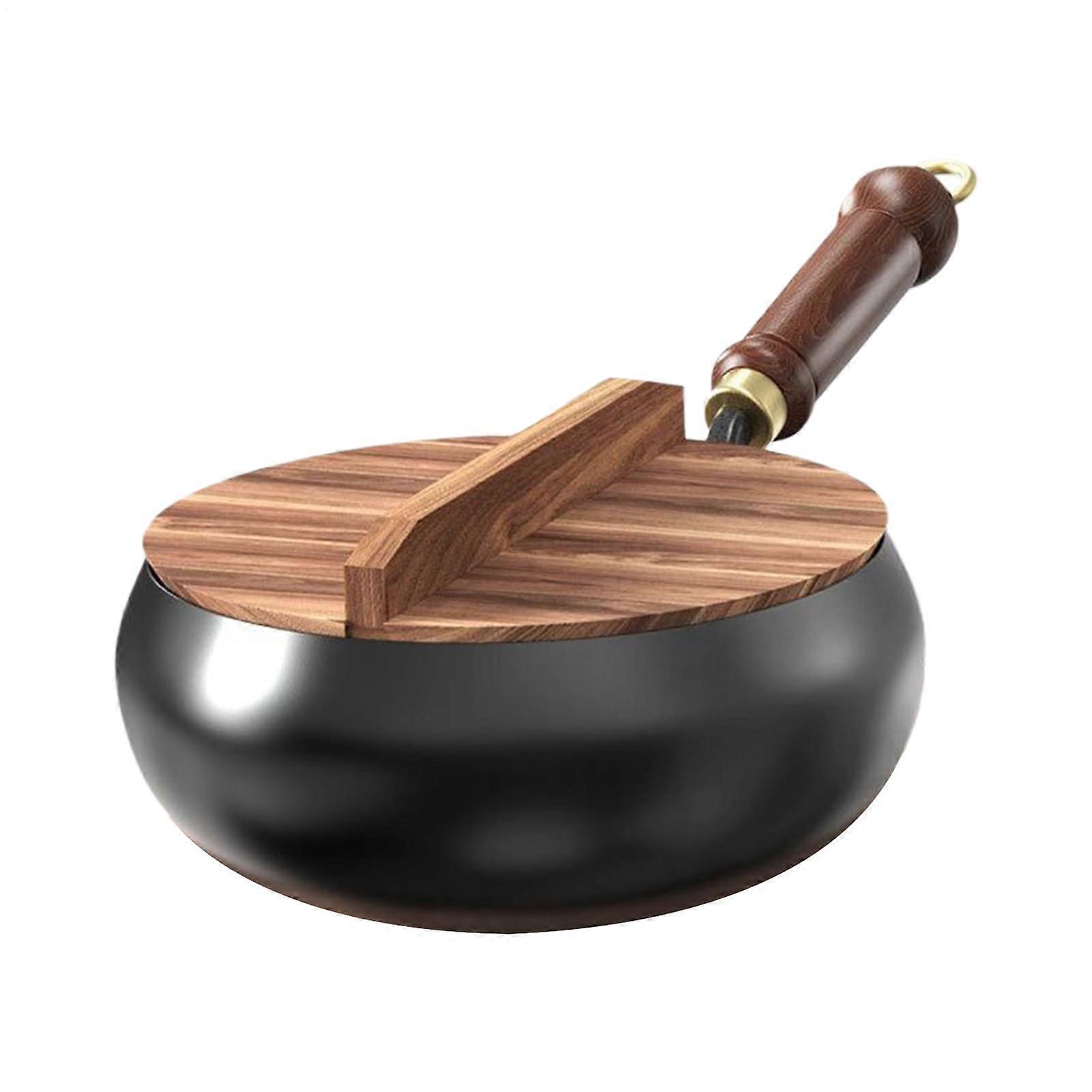24cm Cast Iron Wok with Wooden Lid, Round Bottom Chinese Wok for Induction, Even Heat Cooking