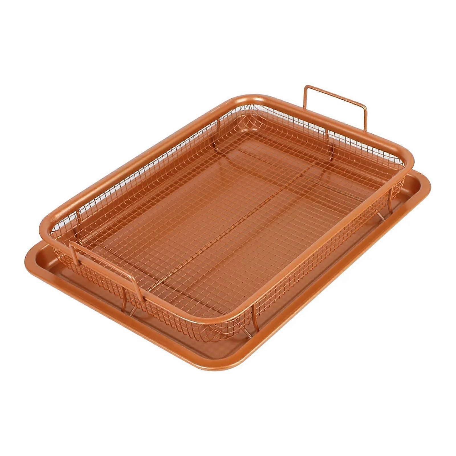 Multimaterial construction for everyday cooking and reliable heat transfer Stainless steel tray provides durable, sturdy support for daily use and ovensafe cooking. Copper components improve heat conduction so foods cook more evenly and efficiently. Crispy mesh that drains excess oil Perforated mesh lets oil and grease drain away when frying or grilling, helping foods like fries and chicken stay crisp. Reduces surface oil and helps lower overall oil intake compared with traditional frying methods. Ovenready and stable Designed to fit in ovens and provide stable support for baking pastries, roasting vegetables, and cooking meats. Tray construction holds items securely for even baking and browning. Air fryer compatible for healthier crisping Mesh design matches air fryer airflow to promote even cooking and consistent crisping. Produces crispy results similar to frying while requiring less oil. Practical benefits customers notice Cleaner cooking: mesh drains fat and reduces pooling oil, making foods crisp without excess grease. Better results with less effort: copperenhanced heat conduction and the open mesh reduce hot spots and improve texture. Versatile use: one accessory works across oven and air fryer appliances, simplifying meal prep. Typical use scenarios Fry or grill homemade fries and chicken: drain excess oil while keeping a crispy exterior. Bake pastries and roast vegetables or meats: stable tray support for even oven cooking and browning. Reheat or airfry frozen snacks and small batches: mesh promotes airflow and crisping with minimal added oil. Materials, function, and compatibility Materials: stainless steel tray with copper components. Function: crispy mesh for oil drainage and airflow; tray for stable oven support. Compatibility: fits ovens and works with air fryers to deliver crisp, evenly cooked results.