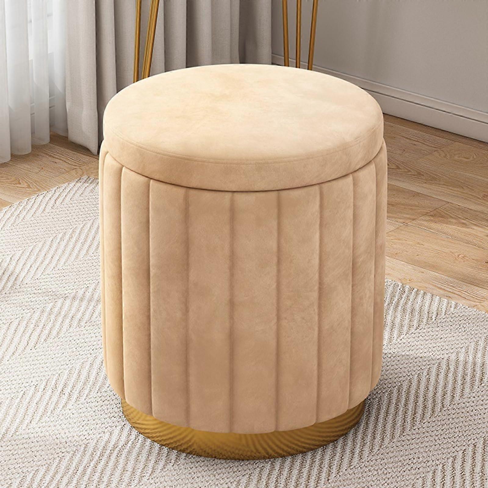 Product name: Round Velvet Storage Ottoman Key benefits Adds style and function: Velvet upholstery and a round silhouette create a refined accent piece that easily complements contemporary, modern, or traditional decor. Hides clutter: The storage version includes an internal compartment with a removable lid to keep cosmetics, blankets, pillows, or daily essentials out of sight and organized. Multiuse seating and footrest: A sturdy gold metal base supports up to 250 pounds, making the ottoman suitable as a footrest, occasional seat, or small side table with a tray. Durable and stable: The metal base combines decorative appeal with reliable support for everyday use. What to choose Storage model: Includes an internal compartment and removable lid for concealed storage. Nonstorage model: No internal compartment; functions purely as seating/footrest. (Select the correct option when ordering.) Materials and performance Upholstery: Soft velvet fabric for a comfortable touch and elegant finish. Base: Gold metal base for stability and a polished look. Weight capacity: Supports up to 250 pounds. Practical uses (reallife scenarios) Living room: Use as a footrest by the sofa, extra seating for guests, or tuck magazines and throws inside the storage version to reduce clutter. Bedroom or vanity: Store cosmetics, skincare, and small accessories under the removable lid to keep surfaces tidy while providing a comfortable seat for daily routines. Dorm room or small apartments: Combine seating and storage in a compact piece ideal for limited space—store linens, slippers, or study supplies while adding visual polish. Why this ottoman solves common problems Saves space: Combines seating and storage to reduce the need for separate furniture in small rooms. Keeps essentials accessible but hidden: Internal storage keeps frequently used items within reach without creating visual clutter. Versatile styling: Round shape and neutral velvet finish work with many decor palettes, so it fits or evolving interiors. Care notes Spot clean velvet with a damp cloth and mild cleaner as needed; follow standard care for metal finishes to maintain appearance. Check model selection to ensure you receive storage or nonstorage version as required.
