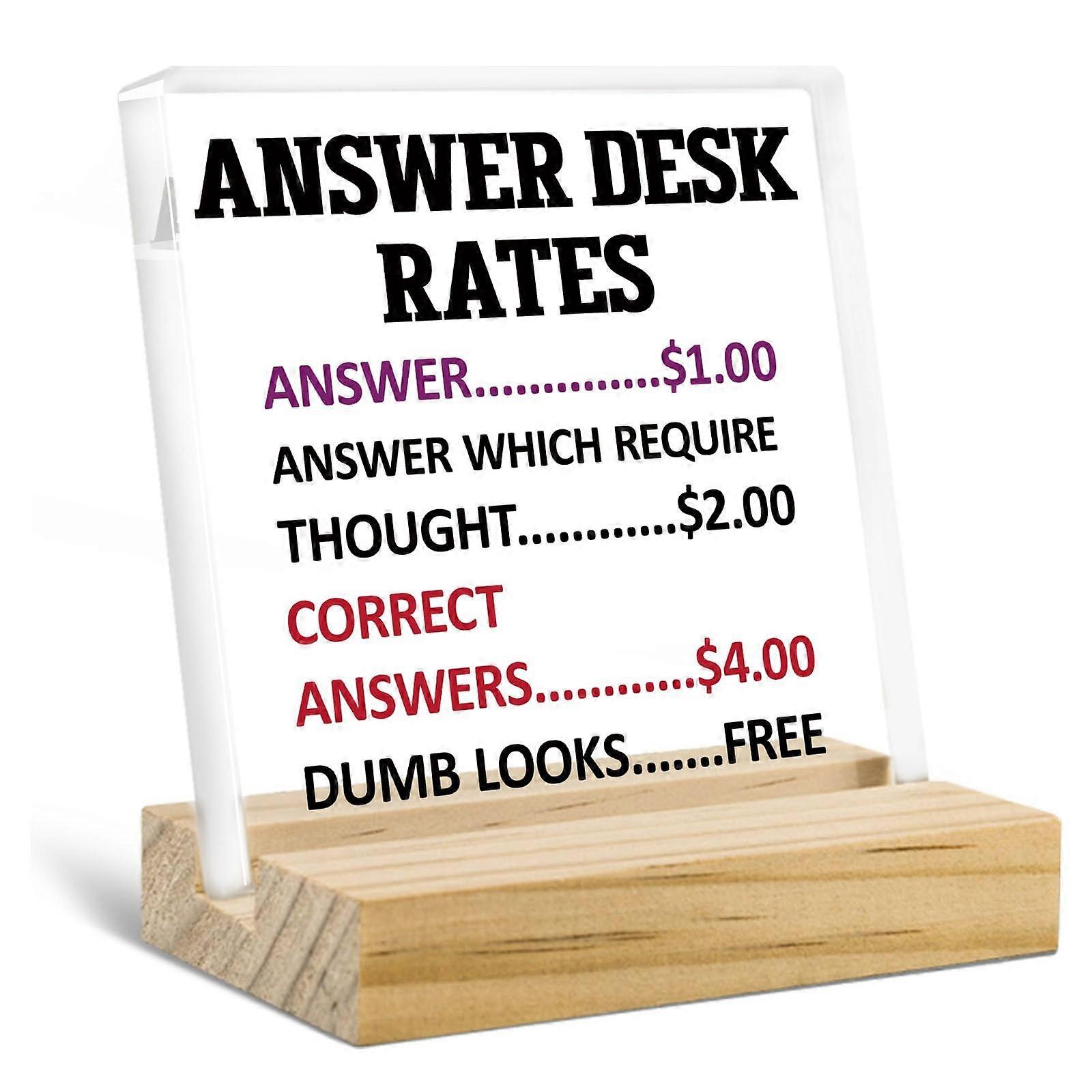 Printed acrylic desk nameplate that reads: 'Answer Desk Rates: Answer 1.00; Answers Which Require Thought 2.00; Correct Answers 4.00; Dumb Looks ''' Key benefits Turns routine frustration into a shared laugh: acknowledges the mental labor of answering questions and lightens tense moments. Instant icebreaker: starts conversations with coworkers and visitors without being offensive. Durable, lowmaintenance display: permanent engraving and a sturdy base mean the sign stays readable and attractive over time. Versatile gift: appropriate for Secret Santa, white elephant exchanges, employee appreciation, promotions, and farewells. Features Material: quality transparent acrylic with laser engraving and clear printing. Durability: the pattern is etched into the material and remains permanently clear; printing will not fade or peel off. Base and display: includes a sturdy wooden base that holds the sign at a stable 45degree angle. Weight and care: lightweight yet durable; clean with a dry, soft cloth to maintain clarity. Practical uses (examples) Desk or cubicle decor: place on partition walls, workstations, or at reception to add and humor to daily workspaces. Gift for team leaders or coworkers: ideal for coworkers who frequently answer questions or manage problems—gives recognition with a humorous touch. Office events: practical choice for Secret Santa, employee appreciation day, promotion gifts, or farewell parties where a light, workplaceappropriate joke is welcome. Who it's for Colleagues and teammates, team leaders and managers, office administrators, and anyone with a sense of humor who works at a desk or in a cubicle. Suitable as Office decor, desk accessory, cubicle decor, gag gift, white elephant gift, employee appreciation gift, teacher desk decor, coworker or boss gift. What it solves Reduces awkwardness and diffuse tension by providing a lighthearted, shared reference. Gives a simple, durable way to recognize the unseen effort of answering questions in the workplace. Provides an easytodisplay, lowmaintenance piece of desk decor that fits common office setups (desks, cubicle partitions, lounges). Note Product ships with the pictured acrylic sign and wooden base. Clean only with a dry, soft cloth.