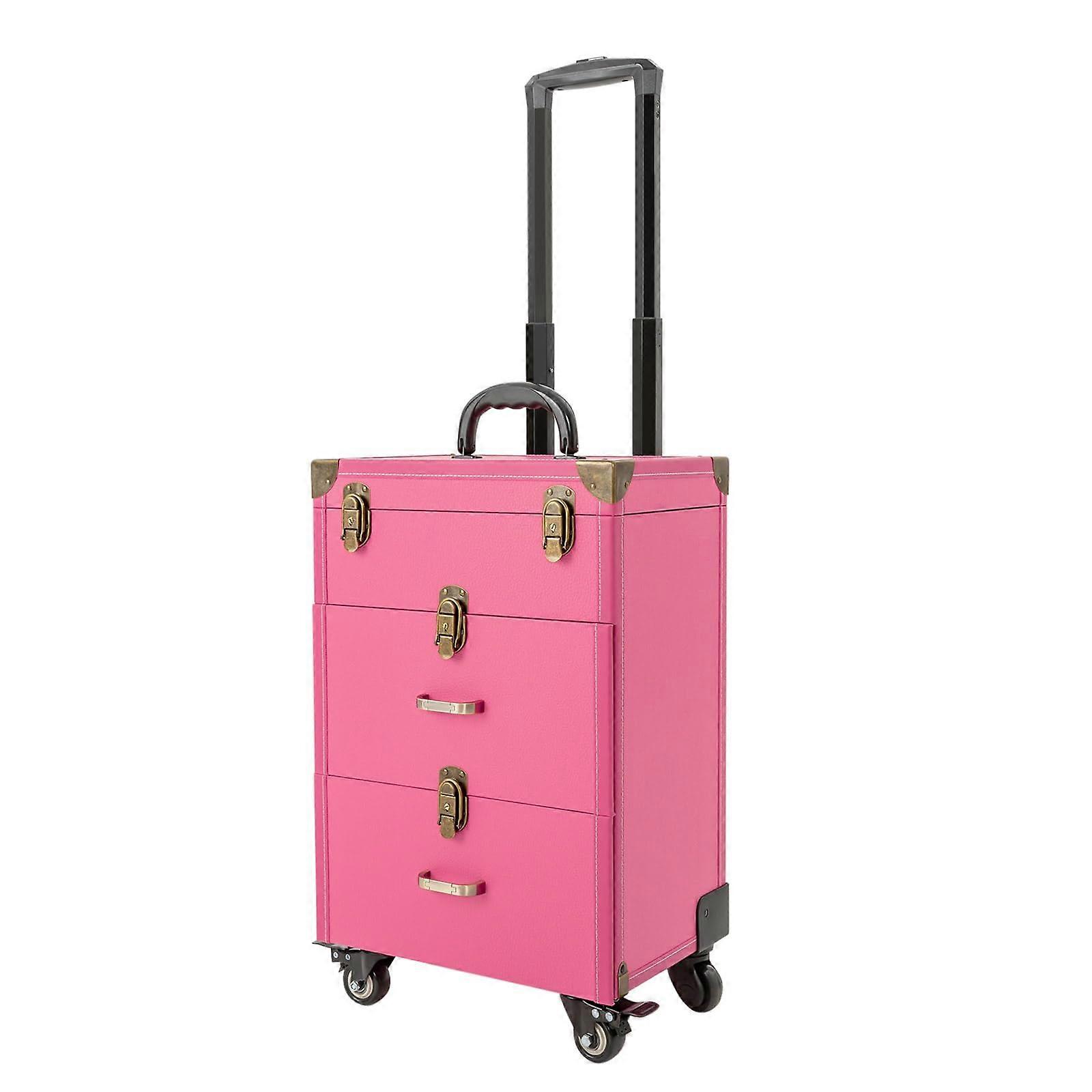 Elegant Rolling Makeup Case – Stylish, Practical, and Built to Last Attractive Design: Features a sophisticated rose color with a rectangular frame, smooth lines, and a refined lychee texture for a modern, stylish look. quality bronze hardware and precise stitching enhance its visual appeal. Durable Construction: Crafted from PU and PVC materials with reinforced corners, aluminum alloy rod, and zinc alloywrapped edges. This case is waterproof, wearresistant, and designed for longterm use. Organized Storage: Threetier compartment layout with cubicles and a large clear pocket inside the lid provides ample space for cosmetics, skincare products, and makeup tools. Removable dividers make it easy to store bottles and tools of different sizes, helping you find what you need quickly. Smooth Mobility: Equipped with four universal wheels, two of which are lockable, for quiet, multidirectional movement and secure positioning on various surfaces. Designed with a telescopic pull handle and a sturdy handle for convenient transport. Practical Applications: 1. Ideal for professional makeup artists who need an organized and portable solution for carrying a full range of products to appointments or events. 2. for frequent travelers seeking a stylish and protective way to transport cosmetics and beauty tools without clutter. 3. Suitable for home use to keep daily makeup essentials neatly arranged and easy to access, reducing time spent searching for items. This rolling makeup case offers both elegance and functionality, making it a dependable solution for storing, organizing, and carrying your beauty essentials.