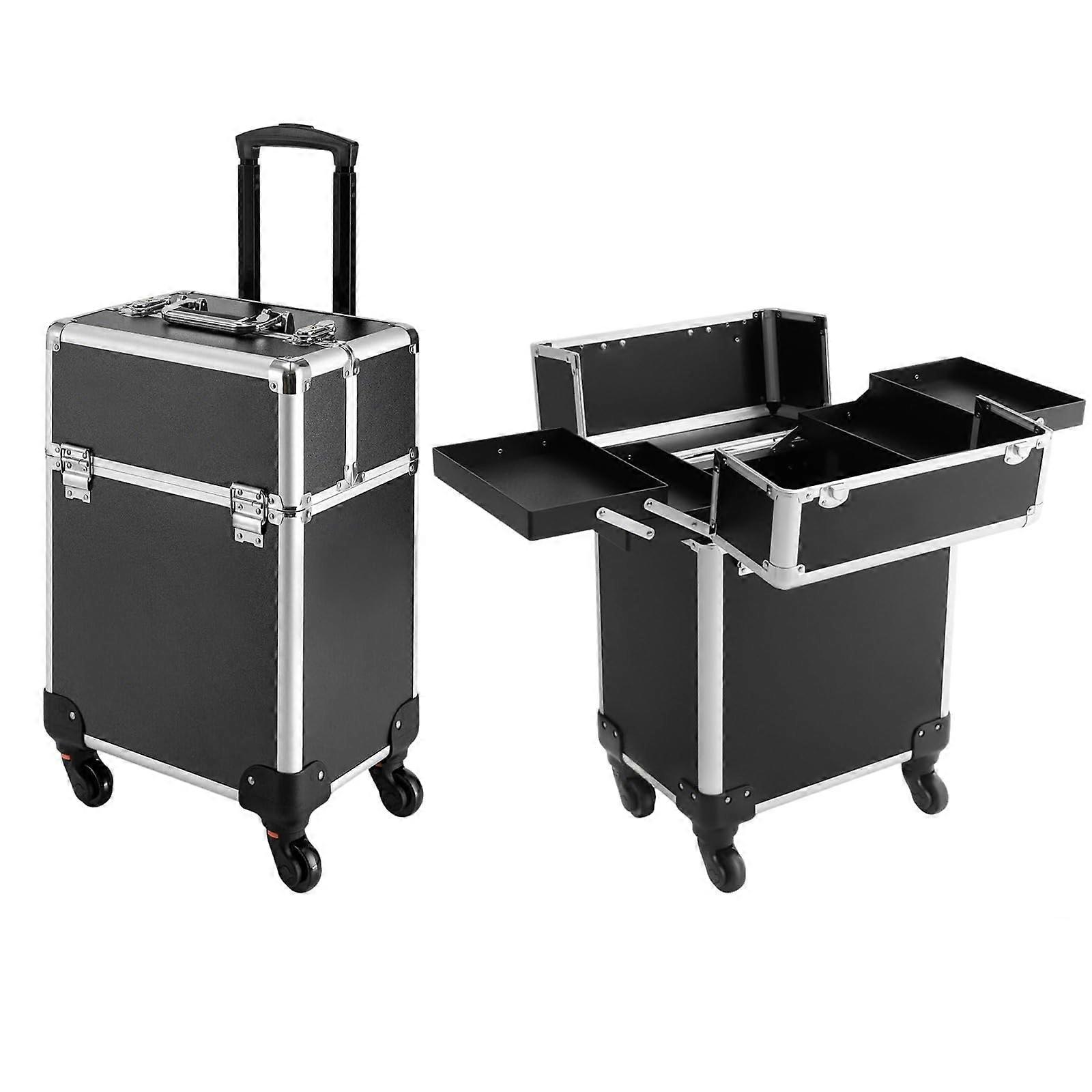 Makeup Train Case with Wheels, Large Aluminum Rolling Cosmetic Organizer with Secure Lock, Black