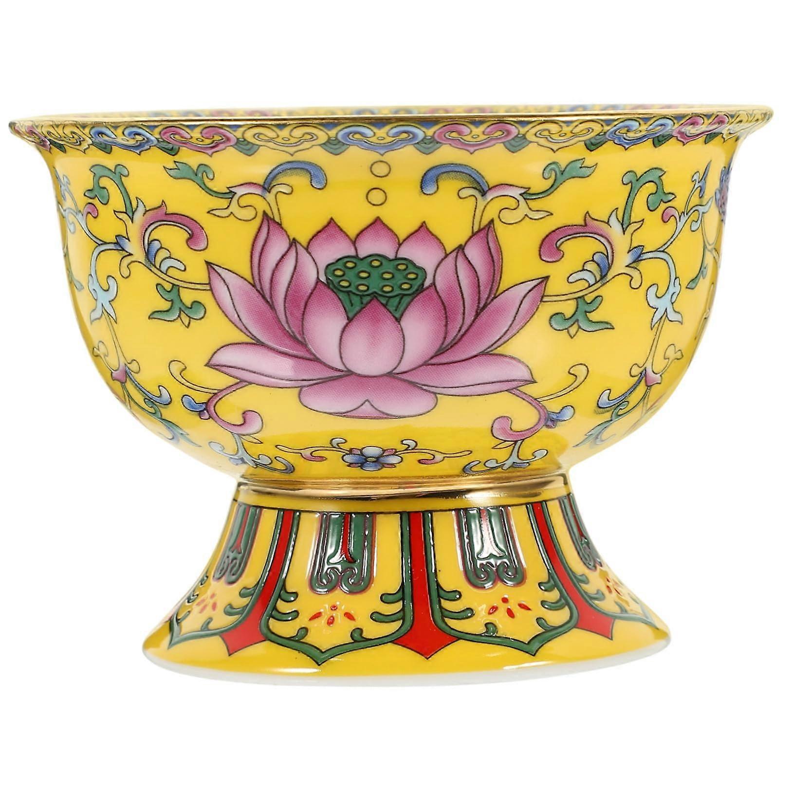 Yellow Enamel Buddhist Offering Bowl Foot Ceramic Temple Tribute Bowl Chinese Style Worship