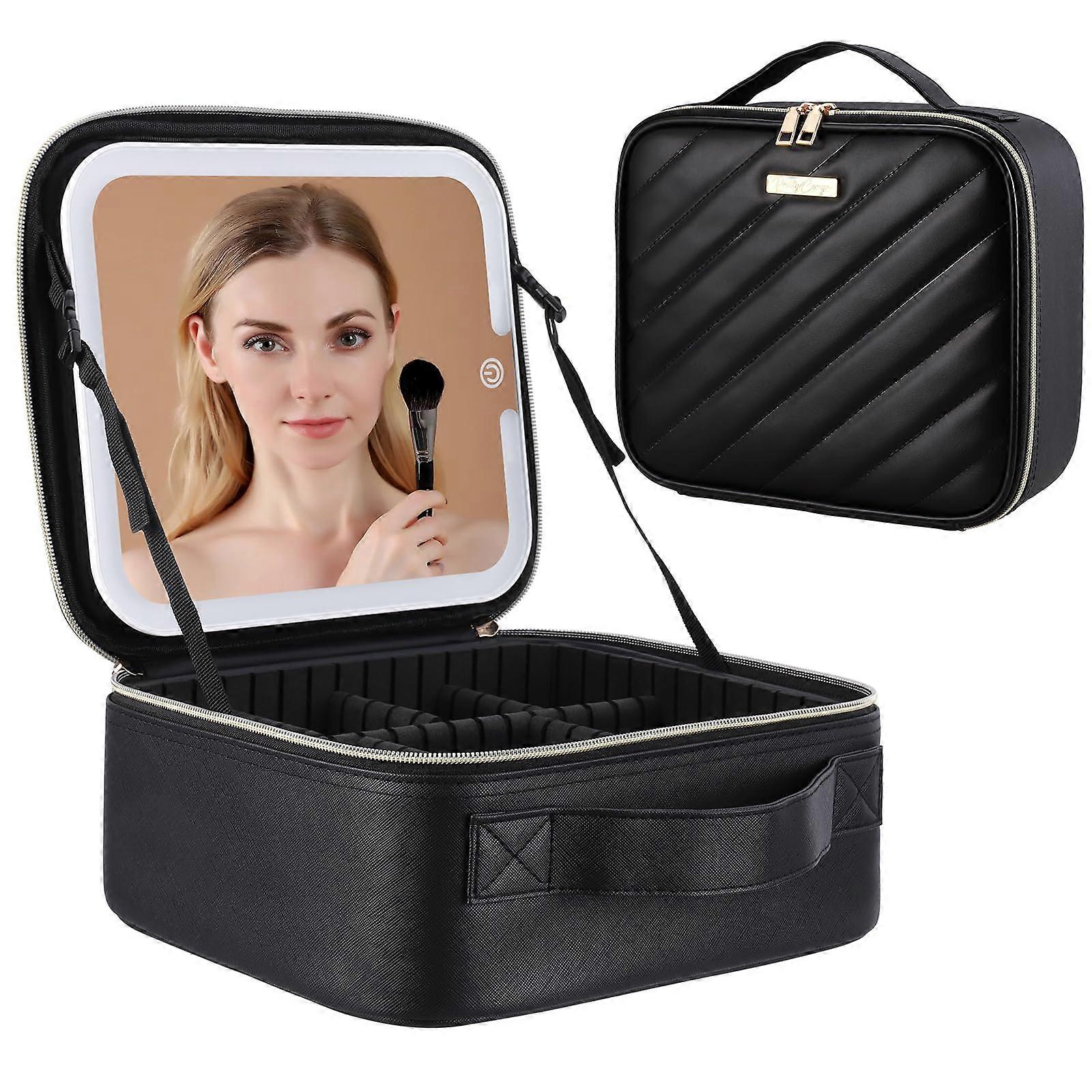 LED Makeup Bag with Rechargeable Mirror, Waterproof PU Leather Travel Cosmetic Organizer Black