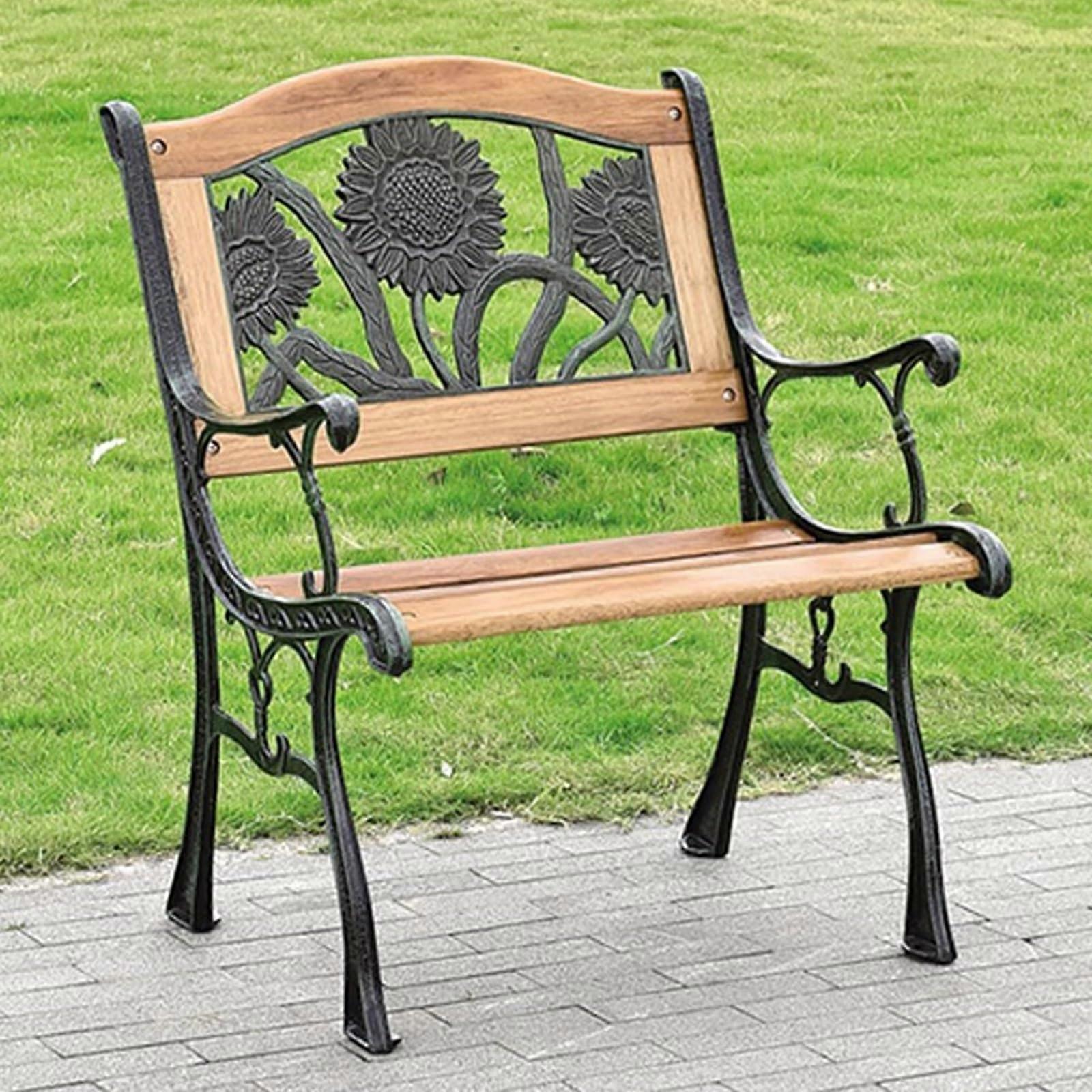 Outdoor Garden Bench Weatherproof Park Bench Wood and Cast Iron Seat Sunflower Backrest for Patio
