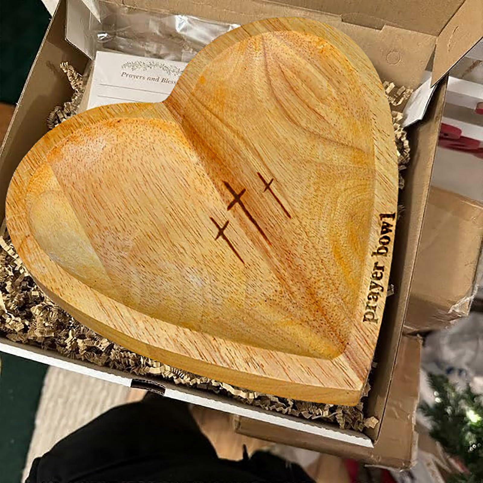 Heart Shaped Wooden Prayer Bowl with Cross, Rustic Handcrafted Christian Decorative Dough Bowl