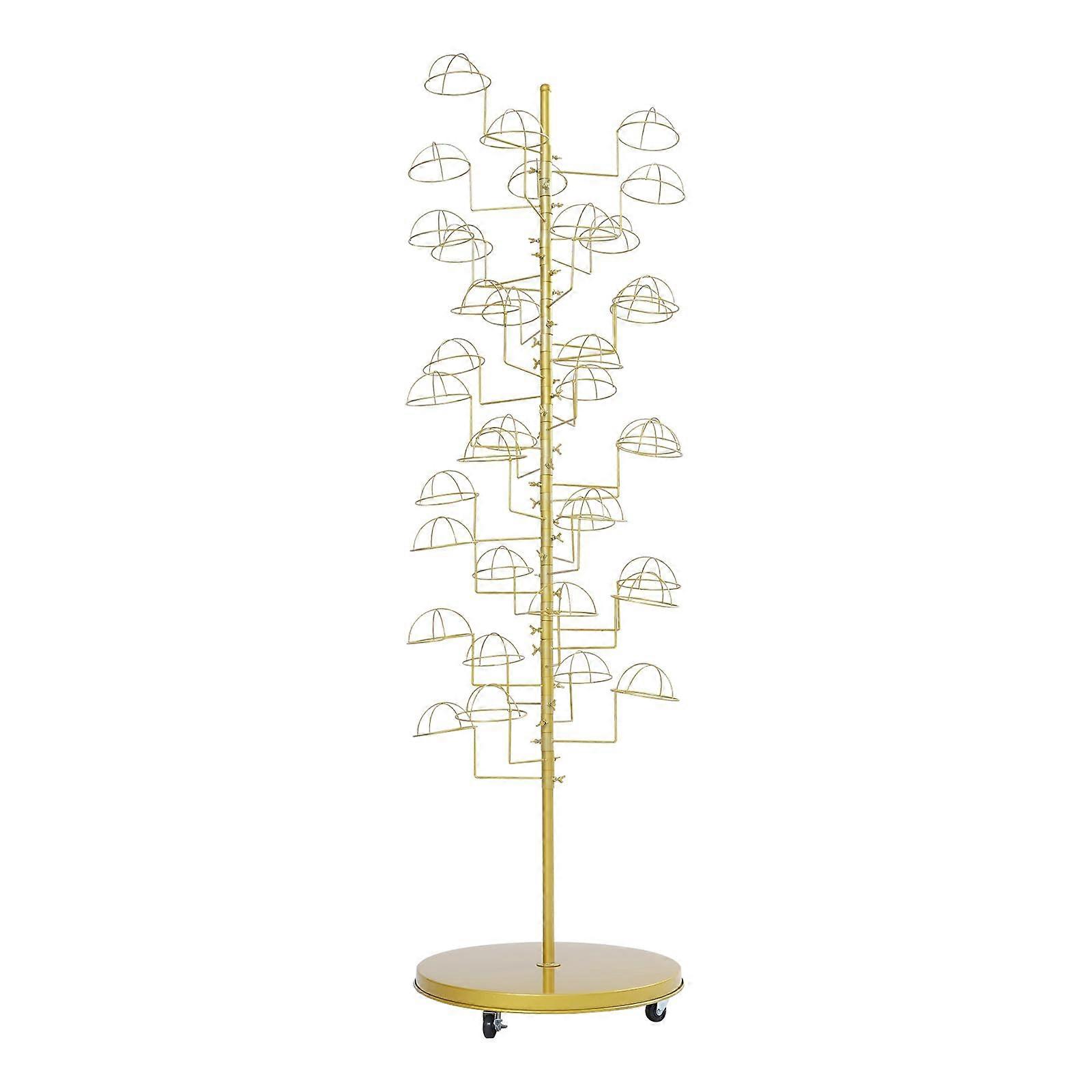 Hat Display Stand 360° Rotation with 35 Hooks Metal Freestanding Hat Rack on Wheels Gold