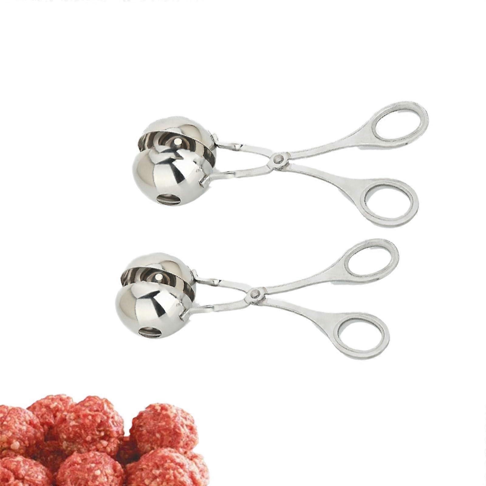 Meatball Scoop Set – 2 Sizes for Shaped Balls Crafted from durable, foodgrade stainless steel, this meatball scoop set is designed for longlasting use and safe contact with food. The set includes two kitchen tongs with scoop sizes of 1.38 inches and 1.88 inches, giving you flexibility for different recipes and portion sizes. Key Features and Benefits: quality stainless steel ensures strength, durability, and resistance to rust or corrosion. Two scoop sizes allow for precise portion control and consistent results every time. Easytouse clip design shapes ingredients quickly, reducing preparation time. Smooth surface makes cleaning simple and hassle. How It Works: 1. Place chopped meat or desired mixture on the scoop. 2. Close the tongs to form the ball; excess mixture escapes through the builtin hole for a uniform shape. 3. Remove shaped meatballs ready for cooking or freezing. Use Scenarios: In the home kitchen for making evenly sized meatballs to cook faster and more consistently. In bakeries or cafes for portioning biscuit dough or forming rice balls with minimal mess. In professional restaurant settings for maintaining presentation quality and reducing waste. This meatball scoop set is ideal for a variety of ingredients including ground meat, cookie dough, mashed potatoes, or sticky rice. Whether for everyday cooking or professional food preparation, it delivers consistent results with minimal effort, helping you save time while enhancing dish presentation.