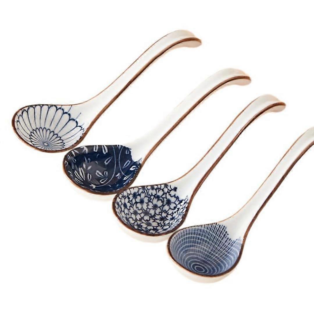 Blue and White Ceramic Soup Spoons Set of 4, Microwave Dishwasher Safe, Elegant Pattern Styles