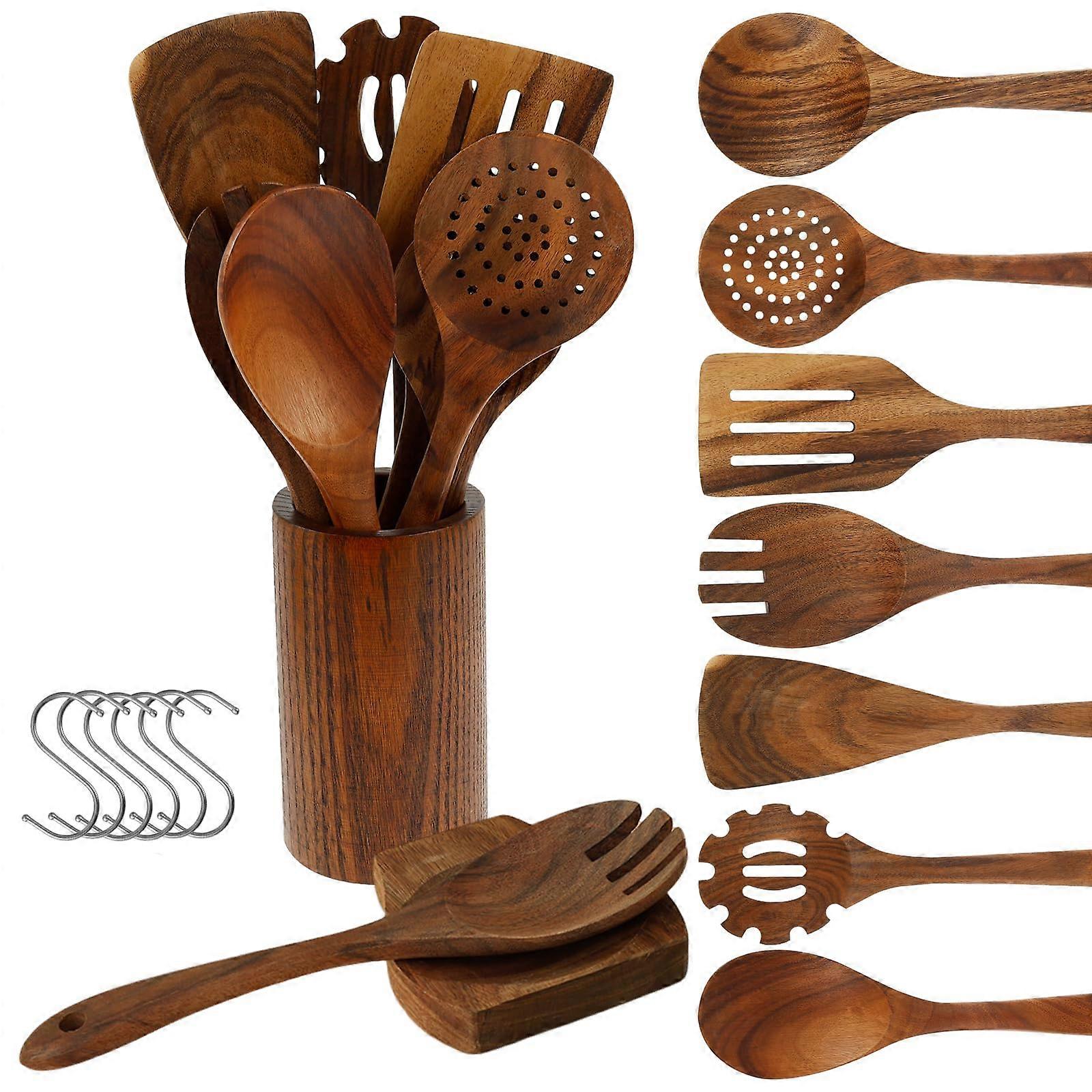 Wooden Cooking Utensils Set Natural Teak 9 Piece with Holder and Hooks Nonstick Comfortable Handles