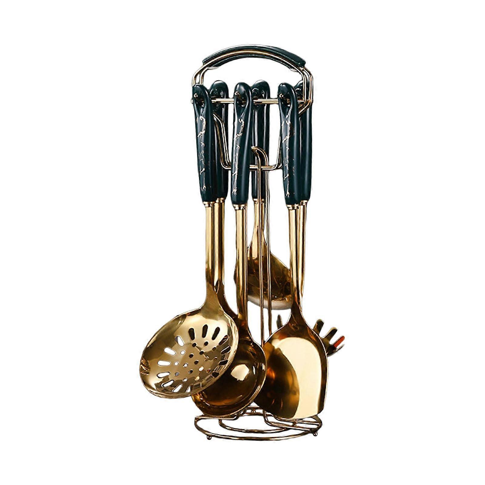 7 Piece Stainless Steel Kitchen Utensils Set Dark Green Gold With Ergonomic Comfortable Handles