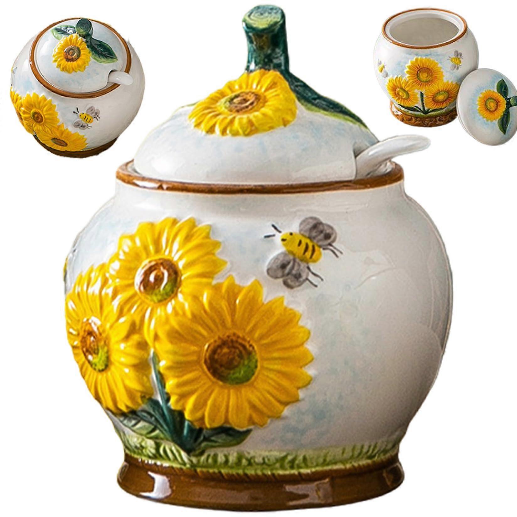 Ceramic Sugar Bowl with Lid and Spoon, Embossed Sunflower Bee Design for Kitchen and Coffee Bar Ref: 9194