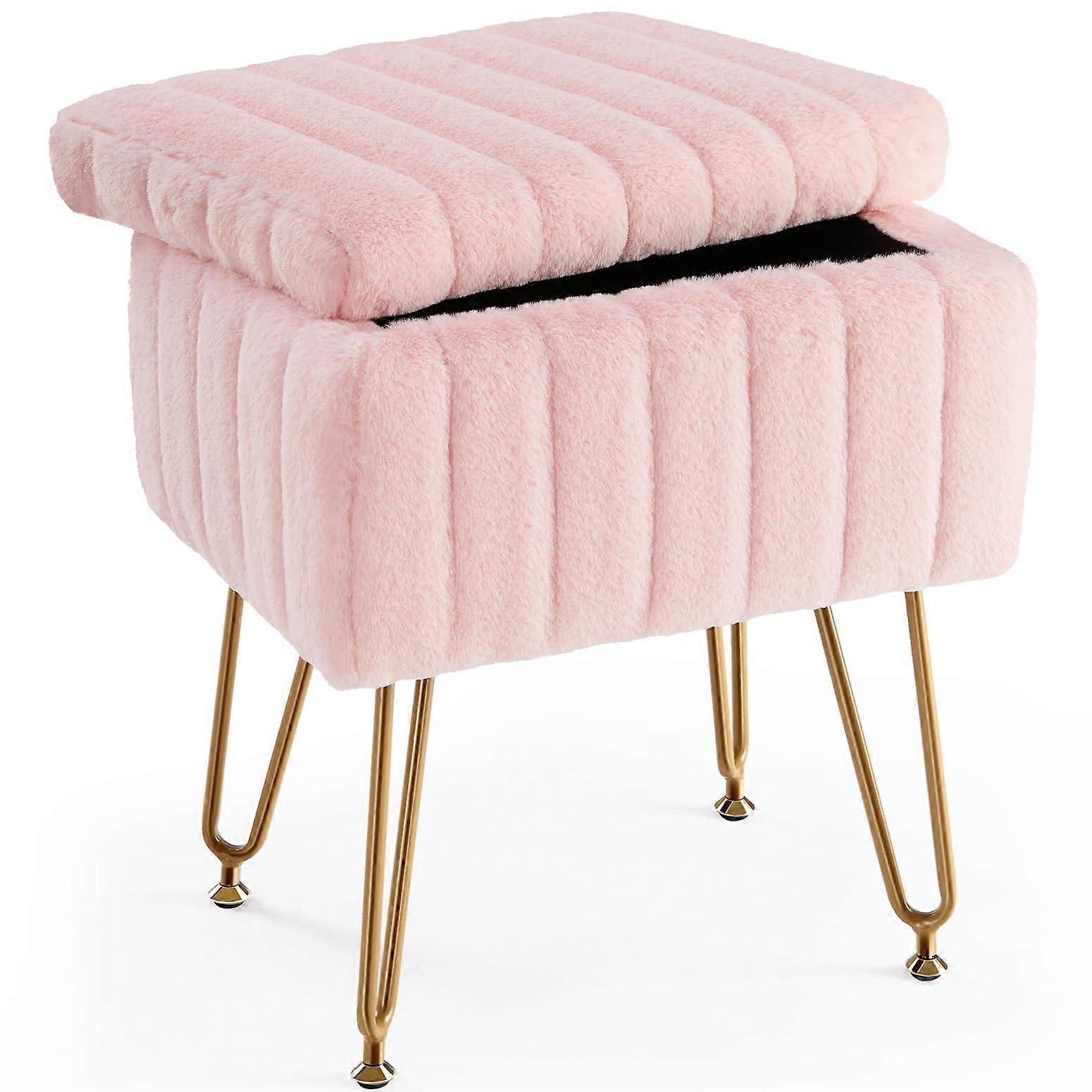 Vanity Stool with Storage Pink Faux Fur Seat Gold Metal Legs Modern Bedroom Makeup Chair