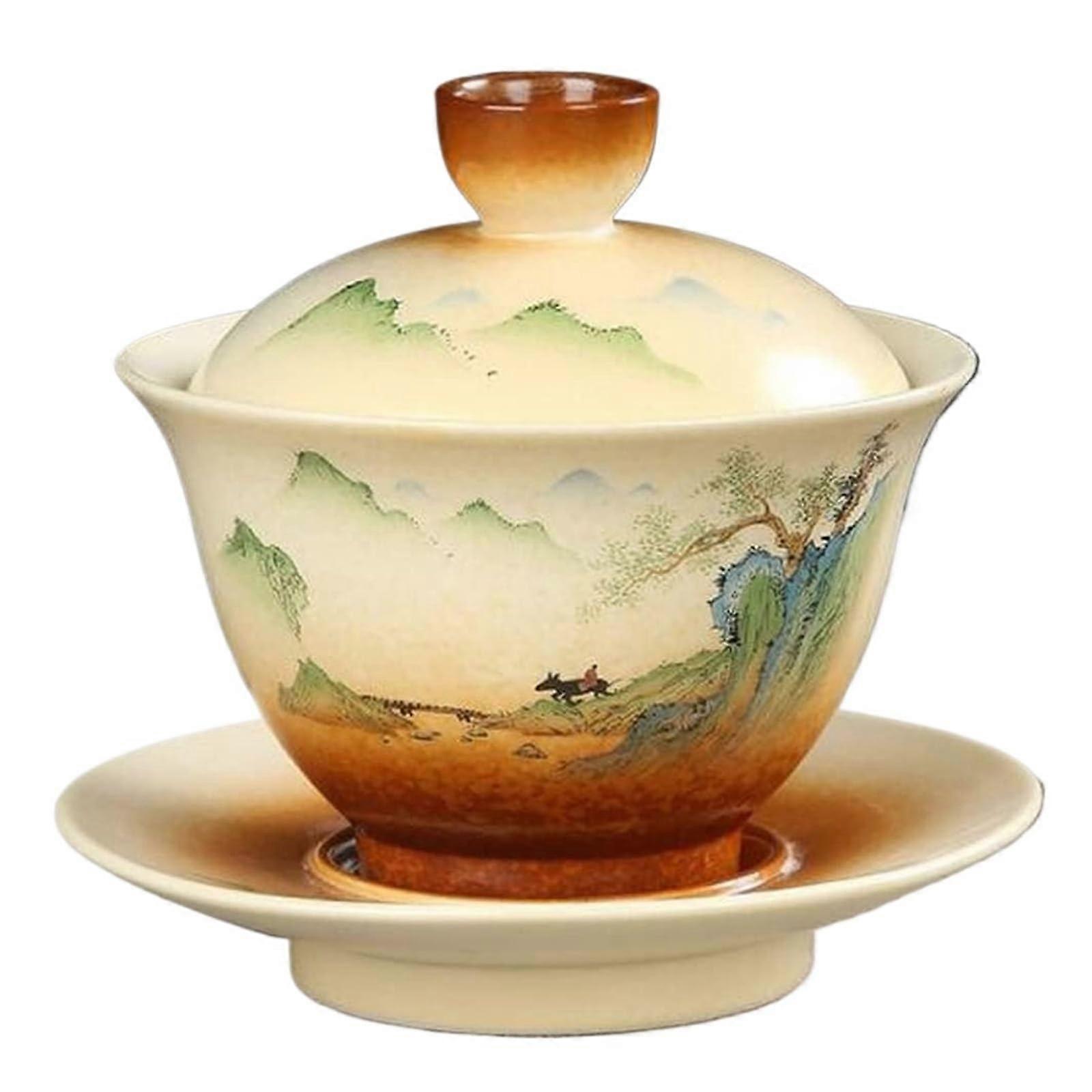 Handmade Kung Fu Tea Set Ceramic Gaiwan Cup 180ml with Lid and Saucer Retro Landscape Design