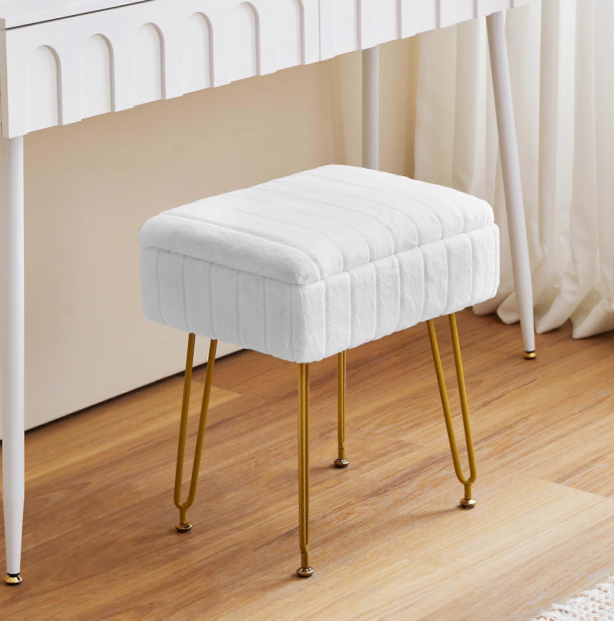 White Faux Fur Vanity Chair with Hidden Storage, Small Makeup Bench with Adjustable AntiSlip Feet