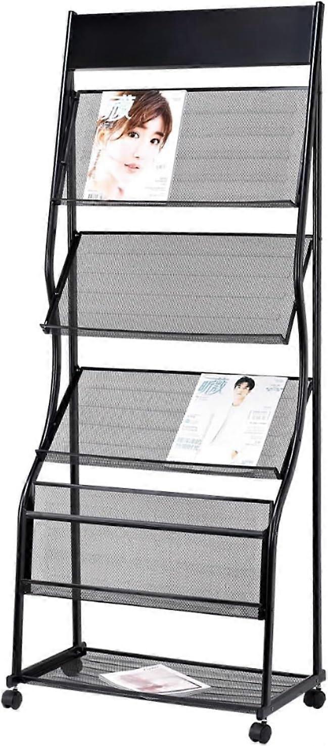 Floor Standing Magazine Display Stand with 4 Tier Rolling Shelves for Exhibitions Black Steel
