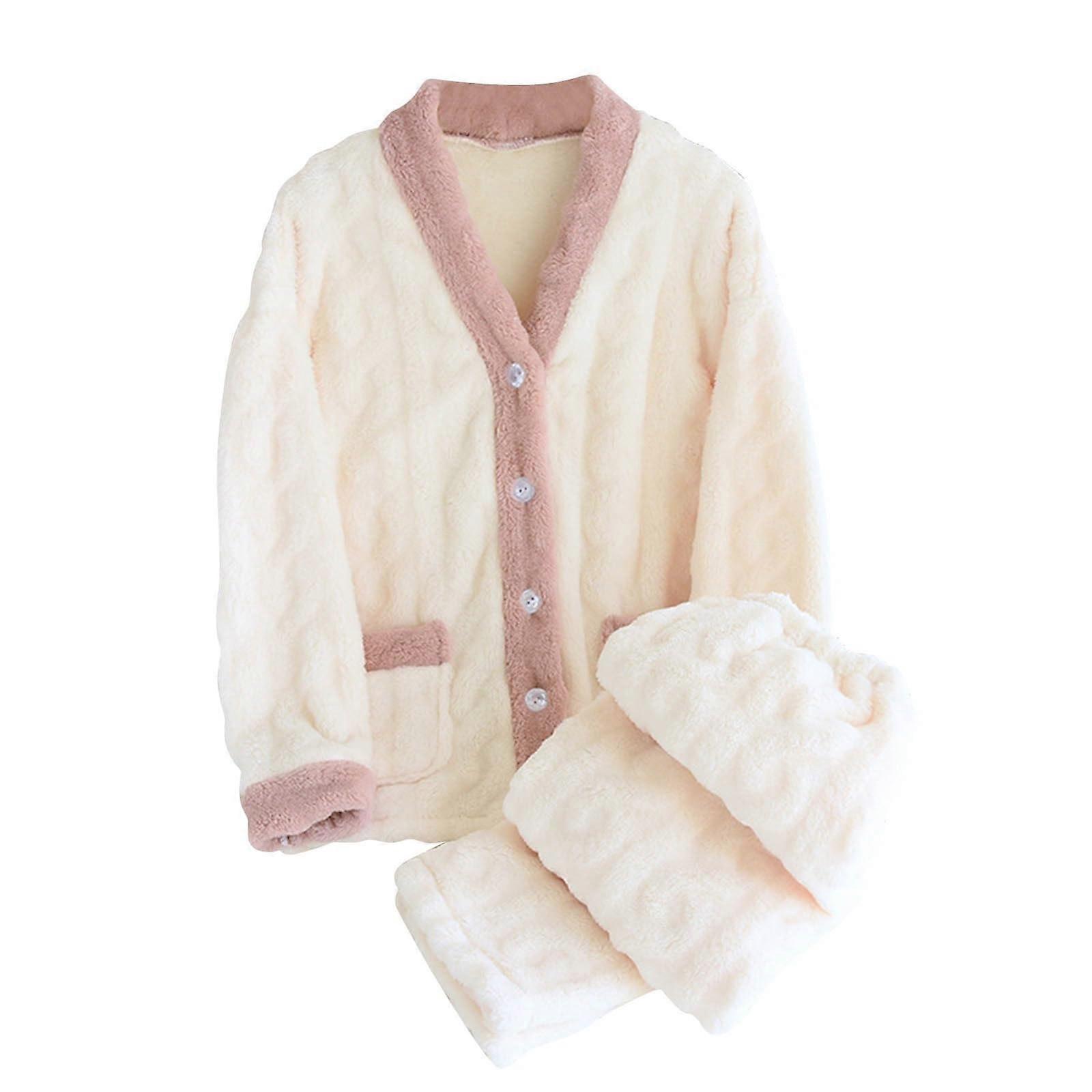 Women's Fleece Pajamas Set Warm Flannel Loungewear with Hooded Bathrobe and Pockets White M