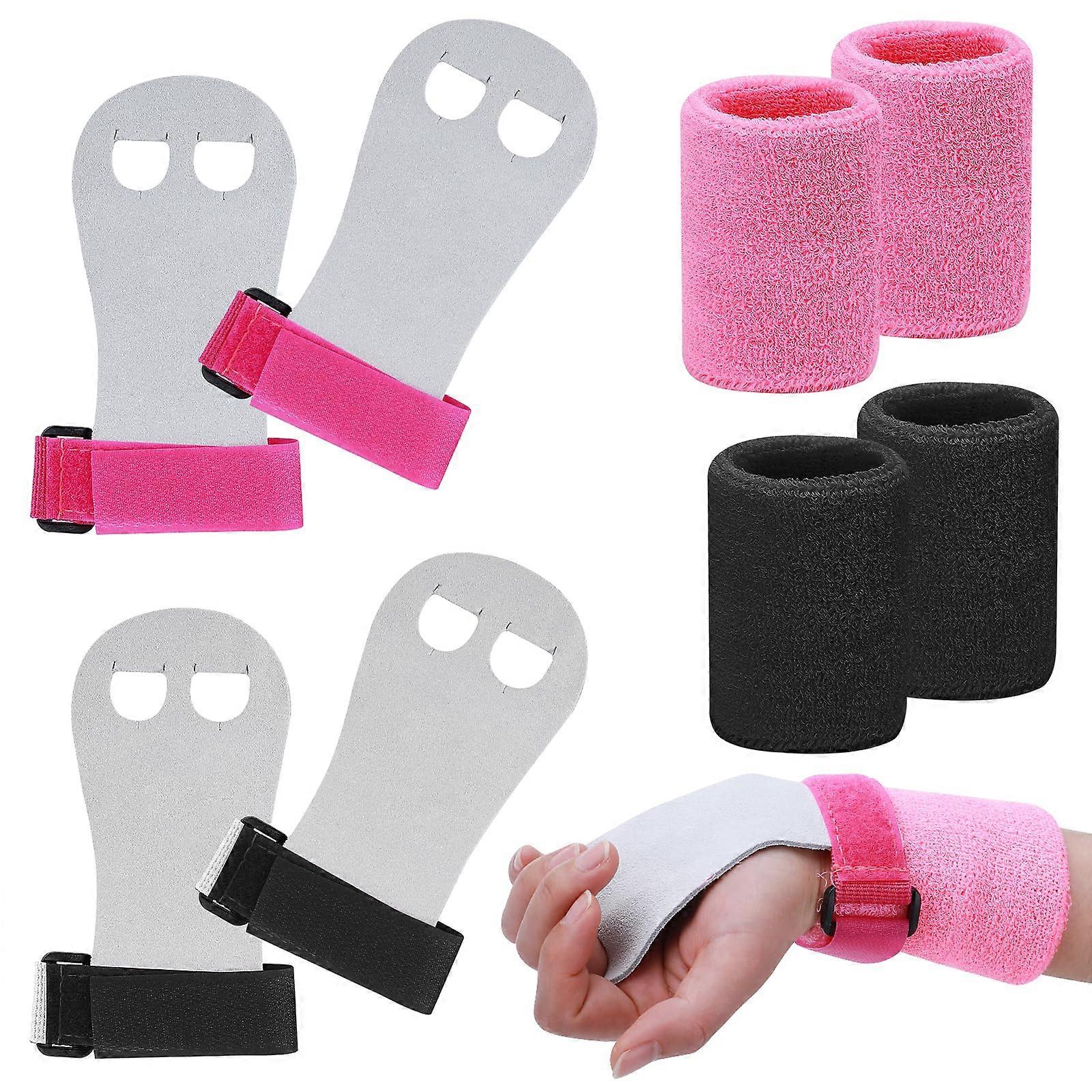 Package contents 2 pairs of gymnastic grips and 2 pairs of children's wristbands. Key benefits Protects young hands: Faux leather grips shield palms from blisters, cuts and bruises during training. Improves performance: Textured leather adds extra grip to reduce slipping on bars and rings. Keeps wrists comfortable: Cotton wristbands absorb sweat and allow airflow to reduce irritation. Adjustable, kidfriendly fit: Designed to fit most children and teens comfortably. Materials and construction Grips: quality faux leather for good abrasion resistance and easy cleaning. Wristbands: Soft, breathable cotton for sweat absorption and gentle contact with skin. Size and fit Gymnastic grips: Approximately 8 x 13.5 cm, adjustable to accommodate growing hands and typical youth hand sizes. Wristbands: Approximately 7.5 x 8 cm, elastic and soft to prevent wrist abrasion while allowing freedom of movement. Performance and care Grip surface texture helps maintain secure contact with gym equipment without restricting motion. Wristbands wick sweat and let skin breathe to reduce slipping and discomfort. Wipe grips clean with a damp cloth; machinewash wristbands on a gentle cycle if needed. Suitable uses (practical scenarios) Gymnastics classes: Use on uneven bars, balance beams and other apparatus to protect hands and improve grip during drills. Home or club practice: Helpful for repeated swings on rings or bars to reduce wear on young hands. School PE and tumbling: Provides cushioning and sweat control during group lessons and basic conditioning. Why choose this set Complete starter set: Two pairs of grips plus two pairs of wristbands cover multiple children or provide a spare set for regular use. Designed for youth training: Materials, size and adjustability match the needs of children and teens without adding bulk. Note Sizes are approximate. Colors and minor variations in texture may occur due to manufacturing.