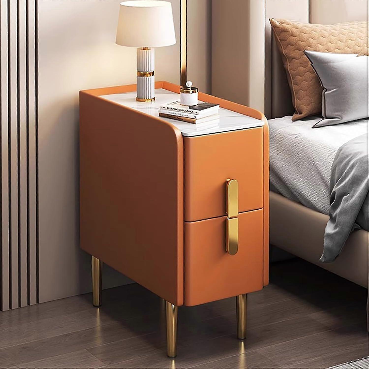 Modern Nightstand with Dual Drawer Storage, Slim PU Leather Bedside Table with Metal Legs, Orange