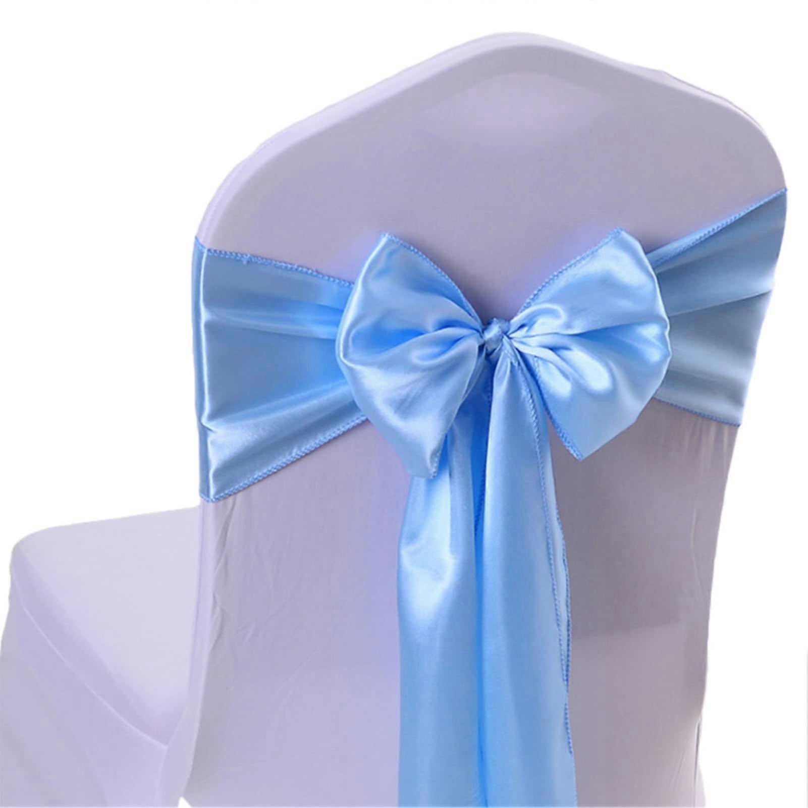 White Satin Tie Wedding Chair Covers with Sky Blue Organza Sashes, Washable and Reusable, 25pcs