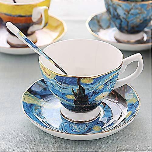 Ceramic Coffee Mug Set with Saucer Starry Night Design Dishwasher Safe Tea Cup for Home and Office