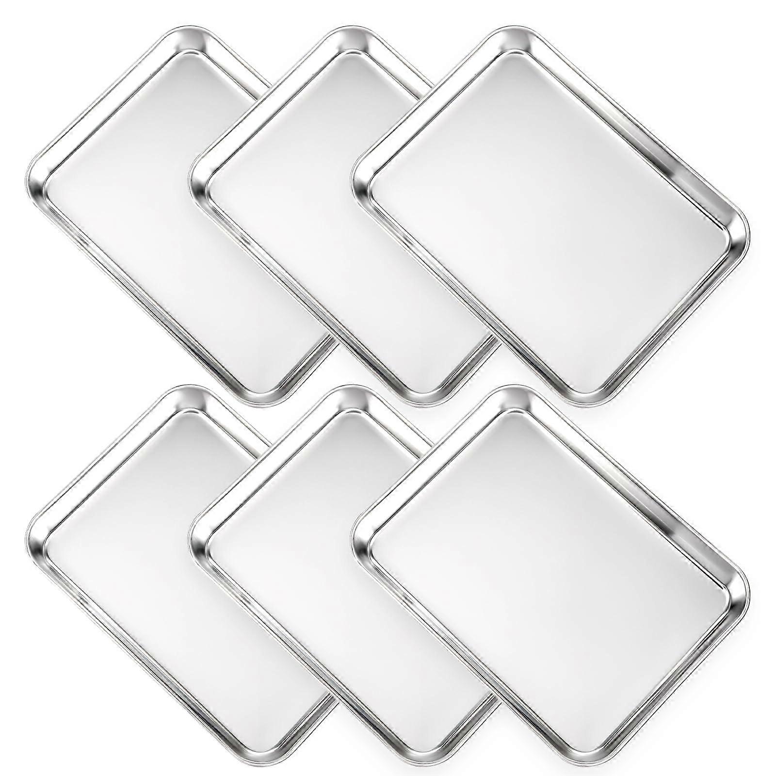 Durable 6Piece Stainless Steel Tray Kit — 9 x 6.7 x 1 inches each Why you need these trays Built for small ovens and everyday use: six compact cookie sheets that fit toaster and compact ovens, grills, and small prep stations. They protect your hands with rolled edges and have 1inch raised sides to contain spills. Longlasting stainless steel: , rustresistant, warpproof construction stands up to oven and grill heat without bending or staining. Reliable cooking results: nonstick surface promotes even browning and easy food release while the stainless base resists stains and odors from meats, desserts, and crafts. Key features Quantity and size: 6 trays, each 9 x 6.7 x 1 inches — designed for compact ovens and tight storage. Safety and handling: rolled edges for safer handling and durable 1inch raised edges to reduce drips and messes. Performance: corrosionresistant stainless steel with a nonstick finish for even cooking and simplified food release. Storage and cleanup: stackable design saves space; dishwashersafe for quick cleanup (handwashing recommended to preserve the nonstick coating). Practical use scenarios Toaster oven baking: Bake batches of cookies or small pastries evenly without crowding a fullsize sheet pan. Weeknight roasting and grilling: Roast sliced vegetables or cook appetizers on the grill or in compact ovens with minimal cleanup. Crafts and prep work: Use as stain and odorresistant prep trays for marinating, small food projects, or craft projects that need a durable surface. What's included and care Includes 6 stainless steel trays, each 9 x 6.7 x 1 inches. Safe for daily oven and grill use. Dishwashersafe, though handwashing will help maintain the nonstick surface over time.